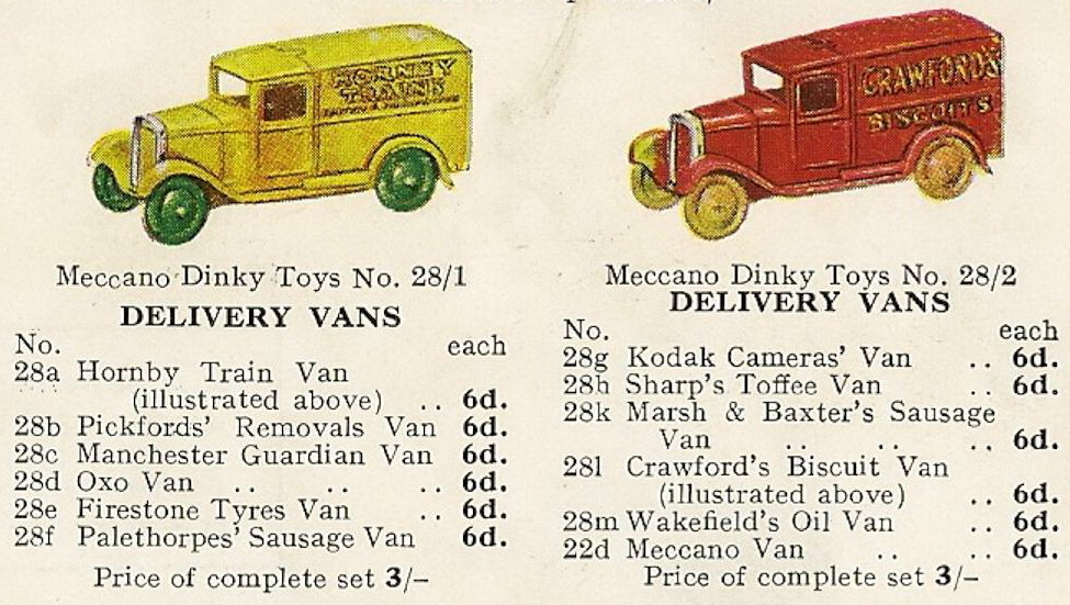 There exist series 28 Type 1 Delivery Vans with cast wheels and rubber tyres, instead of metal disc wheels, with Hornby Series or Meccano Dinky Toys cast-in. I show pictures of both. These Vans are extremely scarce.
