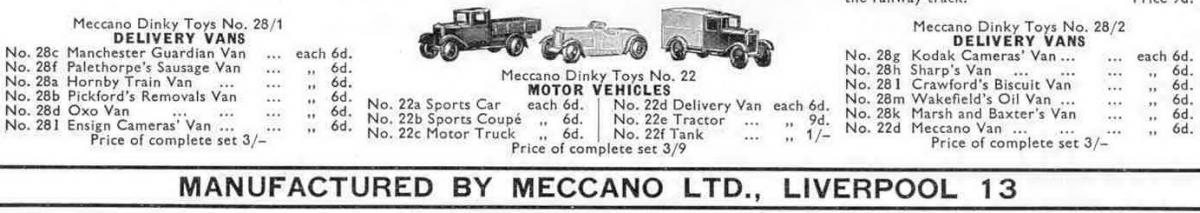 Note: 22d Delivery Van was included in the Hornby Modelled Miniatures / Dinky Toys Series No. 22 Motor Vehicles (without advertising) as well in the series No. 28/2 Delivery Vans as 22d Meccano Engineering for Boys (with advertising).