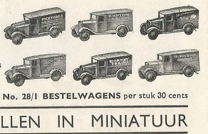 As told, 28m was part of a series of 12 Delivery Vans, divided into 2 x 6 Vans with advertising print on the body side of the Vans. Because Meccano Liverpool delivered Dinky Toys into six pack trade boxes, there were 2 series Delivery Vans. No. 28/1 with 28a through 28f and No. 28/2 with 28g through 22d. All are called (cast) Type 1 Delivery Vans, because after that another series of Delivery Vans Type 2 and Type 3 appeared with another casting till 1941, but they retained their model number when changing cast.