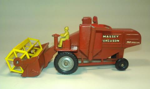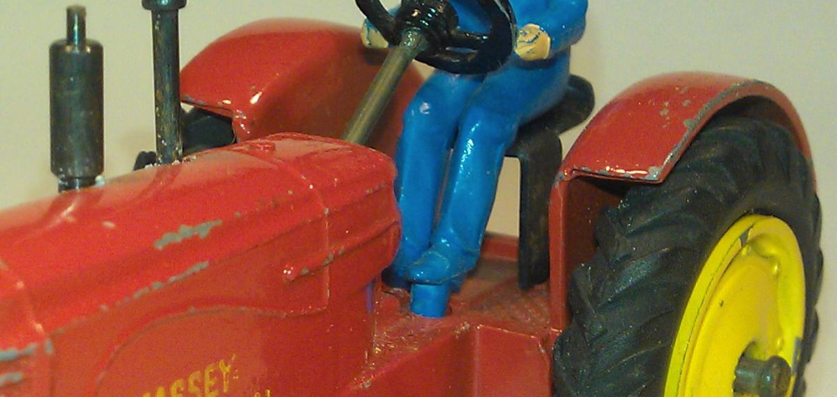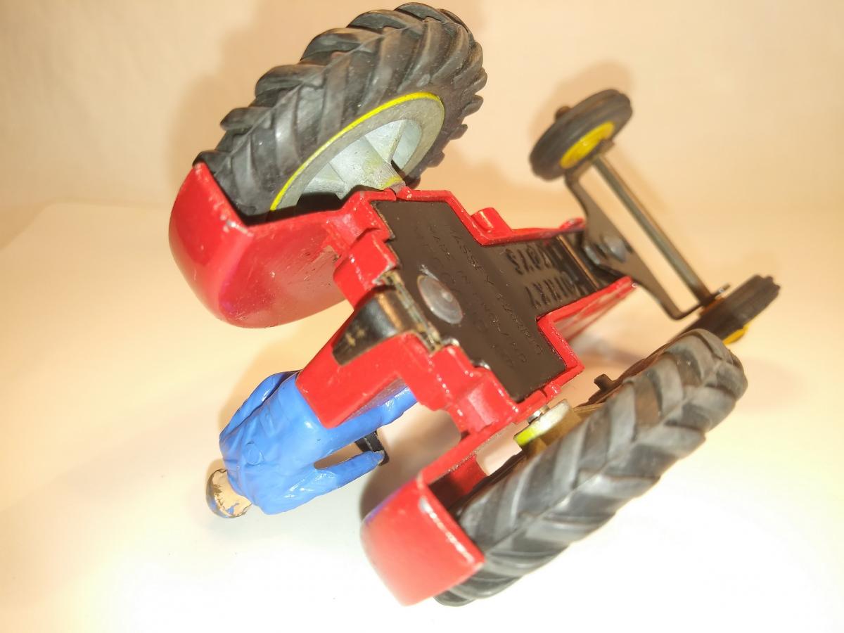 I did not expect to find a Massey-Ferguson model with a blue driver seated on a black metal split chair. I have a picture from QDT with the same model with the regular front tires, so my model is not completely original, because it has not the regular front tires of this type of model, but I like to have it as an example for discussion.