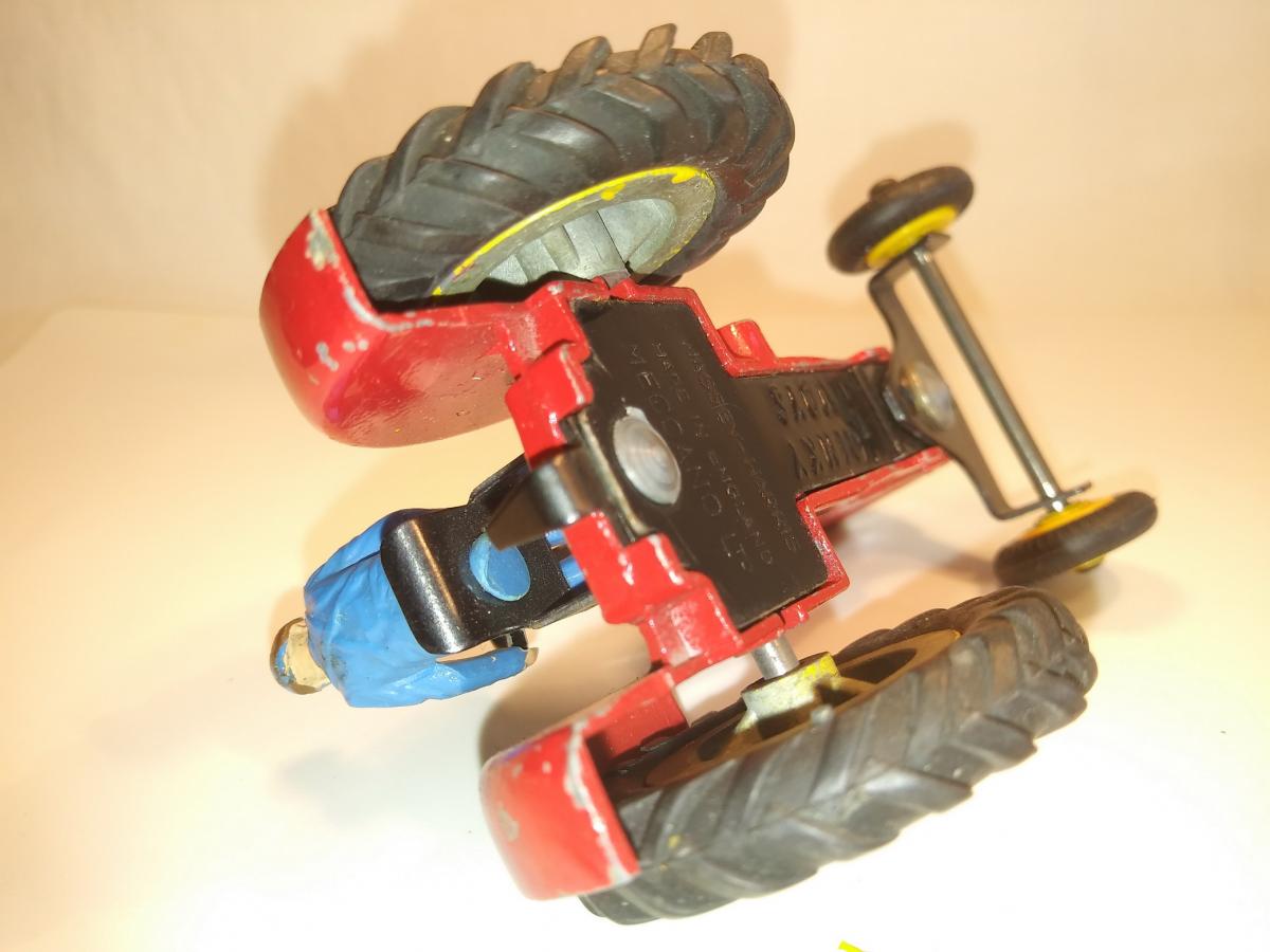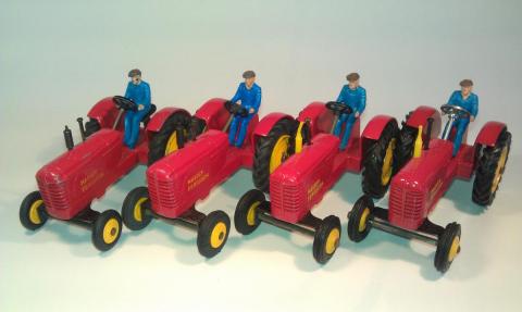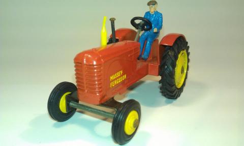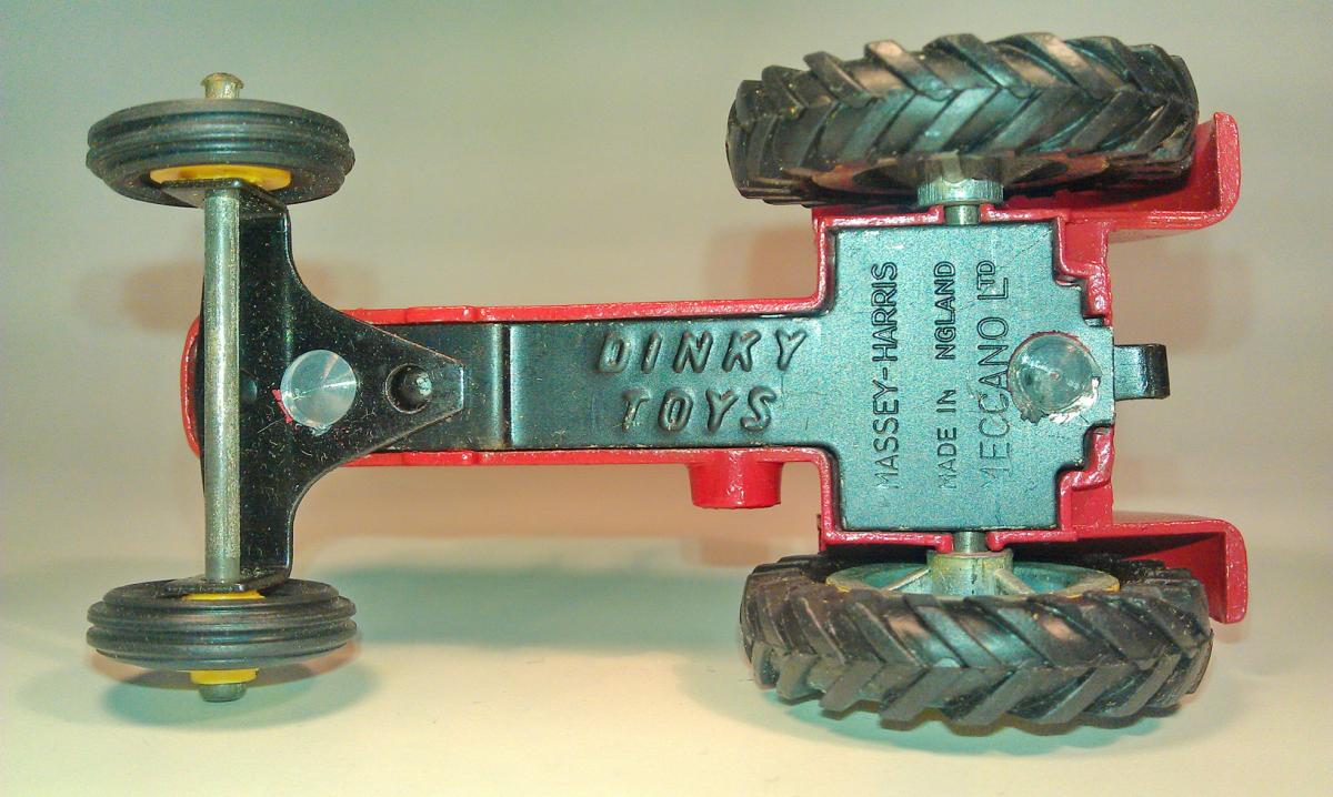 The following information I found in GBDT page 38: red with yellow wheels & tan driver, from 1965 blue driver, from 1966 "Massey-Ferguson" transfer; metal wheels, from 1962 rubber tires, from 1964/5 plastic driver & exhaust, cast-in seat, yellow or blue plastic hubs (Intended is green hubs). And GBDT on page 178: 1962 redrawn 12.3.63 change from Massey- Harris to Massey-Ferguson 7.1.69 transfer changed to sticky label. A Meccano drawing or more information I could not find.