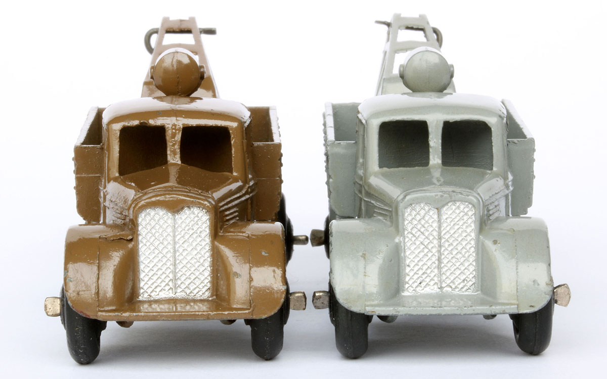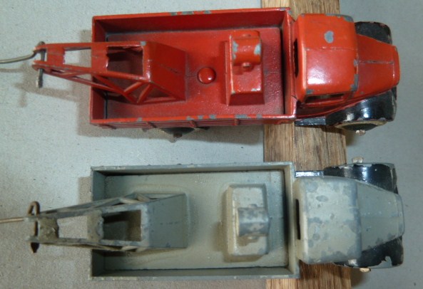 On the pre war models you can find two different methods for connecting the plate with searchlight and crane to the body. One is with a separate rivet, one with the rivet cast to the plate at underside and gives a smooth floor. Both the models in the picture have thin axles and so pre war. It is not clear to me what was first. As there is no sign of a casted hole in the bed of the truck 22c. I wonder if Meccano drilled this hole or there was a second die. On the drawing this hole is drawn as a dotted line.