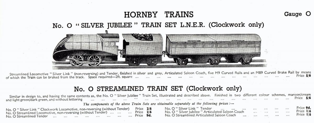 That is a very interesting observation Jose has made. The Hornby locomotive is actually an O Gauge Streamlined Locomotive manufactured between 1936 and 1941, sold as a set or individually as shown with the image below, taken from the 1939-1940 Toys of Quality from Meccano Land catalogue. It was based on the "Silver" class locomotives marking the Silver Jubilee of King George V in 1935, "Silver Link", "Silver Fox, etc.