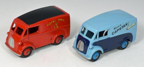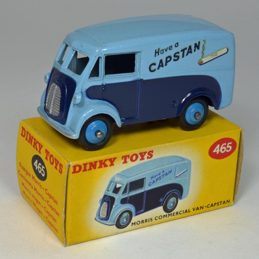 I was surprised to not see a posting already on this little commercial van, so having recently purchased a nice example, I decided to post my comments.  To me, this is somewhat of a curiousity, as it was only made for 3 years.....1957-1959, and was a re-use of the existing 260 Royal Mail Van.  Jan has written a very nice article about this on Talk Model Toys, and you can still find it there, but to somewhat summarize previous comments, it is a puzzle why Dinky did not make other livery versions of this.  It is a very nice casting of a popular delivery van, used for many years.  Some thought has been expressed that due to the fact it was advertising cigarettes, which were even then starting to fall out of favor, that it never really caught on as a model.  It has also received scant attention from the toy community, and is seldom written about.  The Royal Mail van was made from 1955 through 1961, and was very popular, and also plentiful.  The Capstan version, however, being made for only three years, and never hugely popular, has turned into a somewhat expensive acquisition, especially if wanted in boxed, very nice or near mint condition.  For some reason, I too did not buy one years ago, and only the past few years decided that I really needed to have one for my collection, so I started looking.  I saw quite a few listed for sale, but most are not in really nice condition, and the light blue paint tends to show every tiny flaw, either in the paint or the casting itself.  It is a striking two-tone color combination, that Dinky did quite well, but for me, I prefer the solid, single color of the Royal Mail van.....I think it flatters the vehicle a bit more.