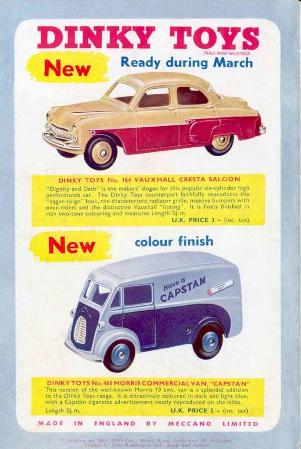 The reason for the Capstan may of course be to make further use of a die when the sales of the postal van were declining, it may also be an order from Imperial Tobacco to make a code 1 promotional. At that time some manufacturers paid Meccano a small fee to have their name on the Dinky. We know that some vehicle manufacturers paid for the die and had to buy the first 500 models at full price. One known example of a manufacturer paying for the tooling is the 976 - Michigan 180 - 111 tractor dozer.