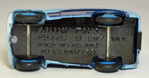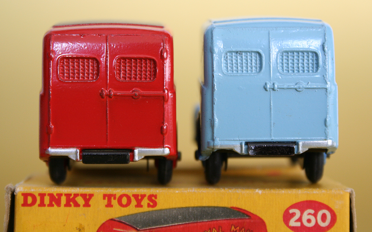 The Royal Mail specified front wings made from rubber (as did British Railways on many of their vehicles) on many of their vans rather than the normal steel versions so as to be more resistant to minor bumps and scrapes. On the Morris J van, this meant securing the headlamps to the cab sides rather than the normal position on the wing tops. This feature, and the security mesh and external locking bar was correctly modelled by Dinky. Most real non-mail vans also lacked the front bumper.