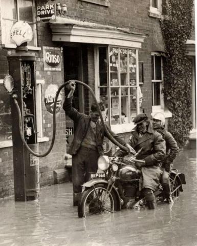 1935. Motorcyclist with duo passenger with the wheels of his Ariel engine in the water, refuelling petrol at a Shell petrol pump, in a flooded village on the River Medway in southern England.