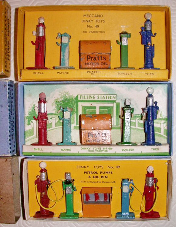 Dinky Toys 49 Petrol Pumps Set boxes inside. The top two are prewar. The bottom one is postwar. Photo Peter Golden TMT