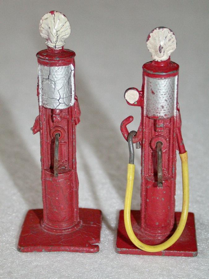 49d Shell Pump Peter Golden TMT. Left prewar one with white rubber hose– right postwar one with yellow plastic hose. Note the difference in length, possibly due to fatigue of the left one?