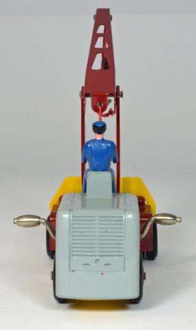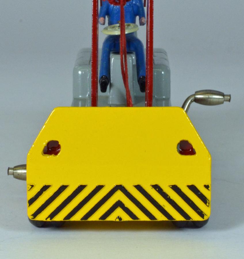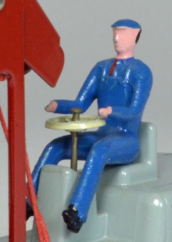 This is another new French Dinky model that I recently received, and it appears that nothing yet has been posted concerning it, so here is my contribution. I had never seen a real example of this model, only occasional photos or catalog images, and it was so different from its British cousin cranes that I did not give it a second thought, until recently, when I finally realized it is in my interest time period of collecting. I was able to find a very nice example, and after it arrived, I was again surprised at what a nice model it is. These were first introduced in April, 1957 and only made until late 1960, so they are not available in great numbers. Due to its short life span, there are not too many variations available, and I will touch on those a little later. The model itself is typical of the French products of the late 1950's in that it is very well finished and detailed, and the whole model is somewhat "elegant" for a simple crane. Nice features are the use of dual wheels and tires on the front (the wheels look exactly like those dual ones used on the Berliet Container truck, but with the smaller tires), and a nicely painted driver. I had read somewhere that the driver has a red necktie, and after taking a close-up photo, I can confirm that is true! He also sports a blue uniform and cap, and his hands and face are flesh colored, with his black hair and boots also nicely shown. Much more detailed than the British drivers on various models. My main complaint has to do with its operation...the winding mechanism that raises and lowers the jib or boom, only has very light "detents" or stops at various points, compared with the Coles Mobile Crane. This means if you try to lift anything heavy at all, it will simply lower itself to the ground, so I would have to say that the play value of this little crane suffers compared to the Coles. There was only one color scheme used, but later in production, Meccano changed the ridged rear wheels to a concave style and also changed the manner that the jib was fastened to the body, utilizing a visible rivet. About the same time, the number was changed from 50 to 595.