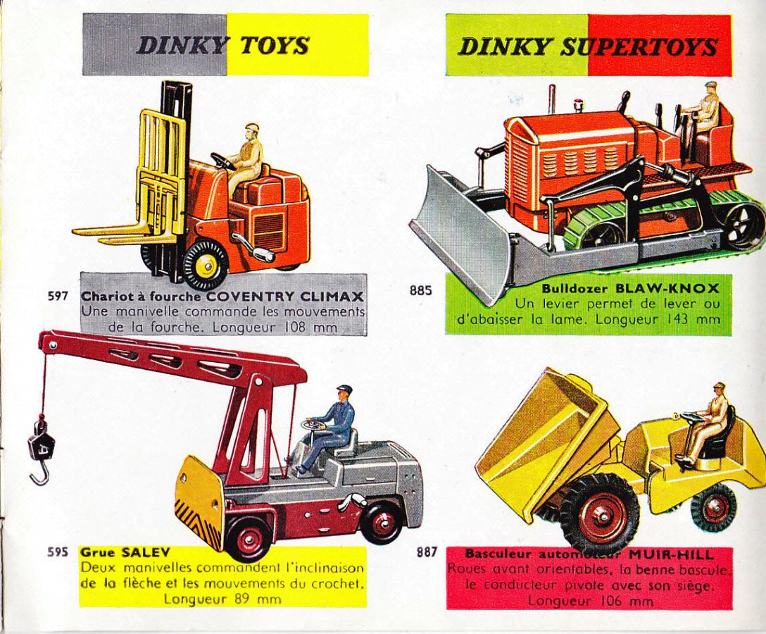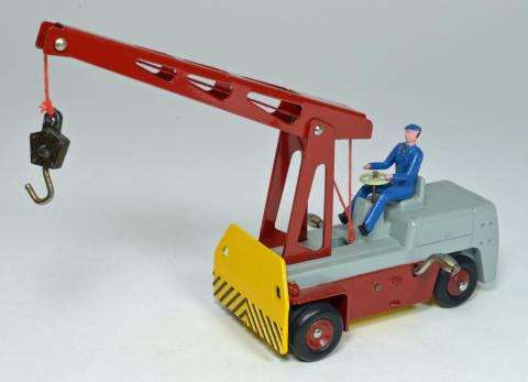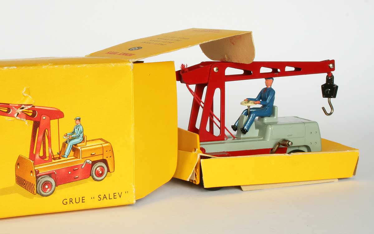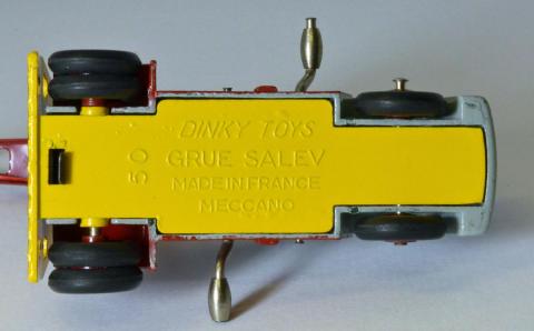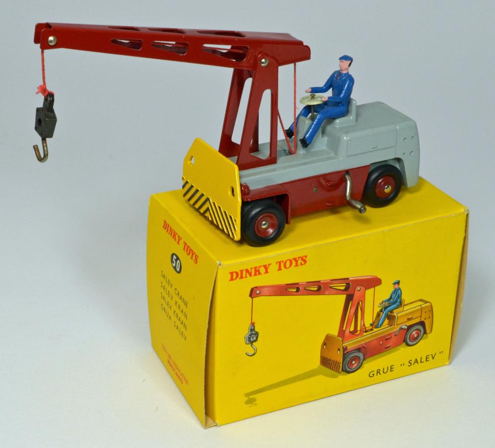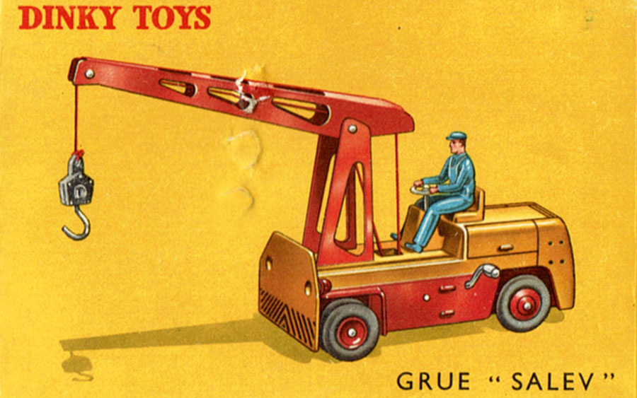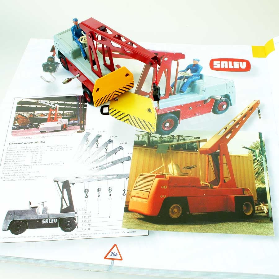It is hard to find a picture of the real one. Redempt/Touillez (Utilitaires Dinky Toys et Dinky Supertoys) show an (apparently later) all orange one. It seems that more Salev fork lift trucks were made than cranes, of the former of which I did find a picture on the internet, and in the correct colours. By the way, the crane could not swivel, that had to be done by steering the wheels (like a fork lift truck). Better than the English Coventry Climax Fork Lift Truck, the wheels on this model are double, conform reality.