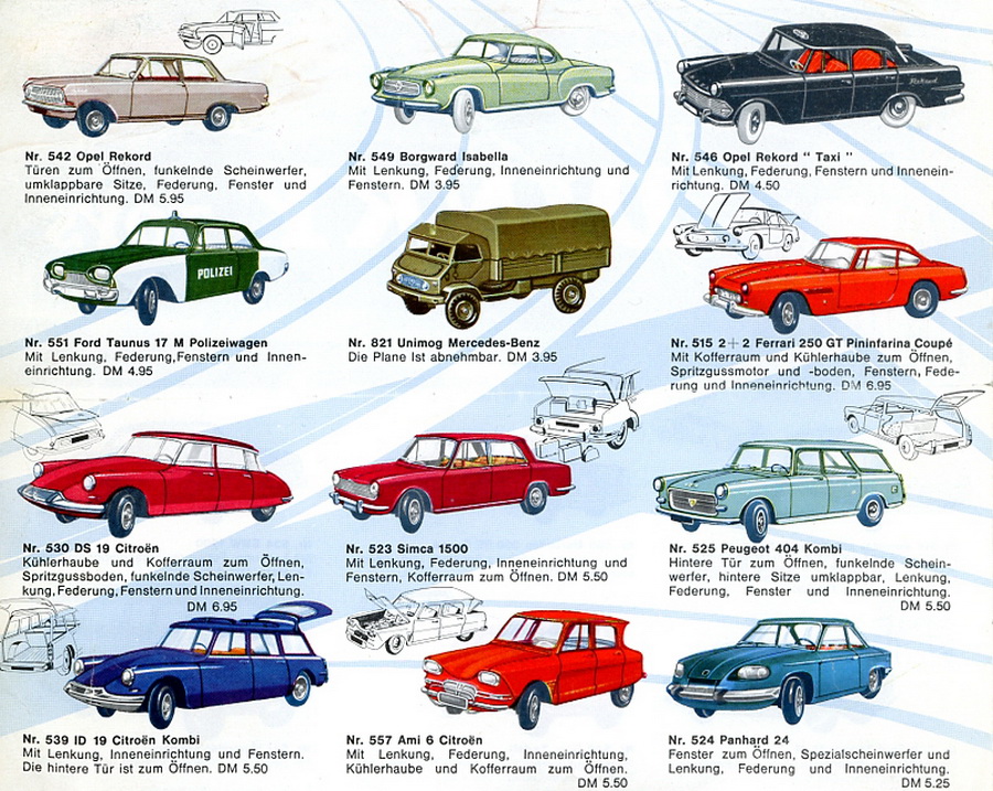 Dinky Toys 546 Opel Rekord Taxi in catalogue West Germany 1964. Note also the German export model DT 551 Ford Taunus 17M Polizeiwagen and DT 542 Opel Rekord as successor of the 554. Photo by courtesy of Jacques Dujardin.