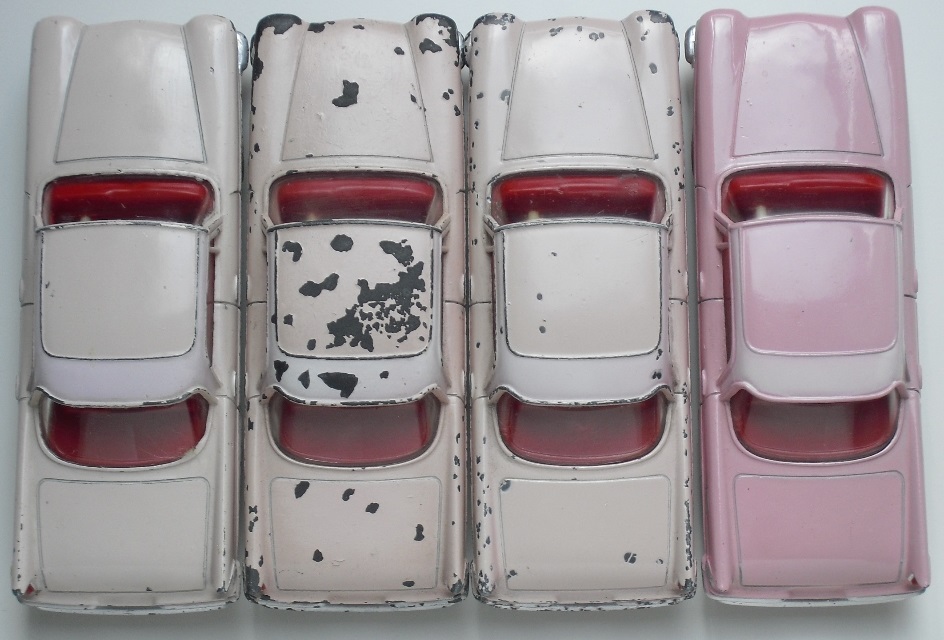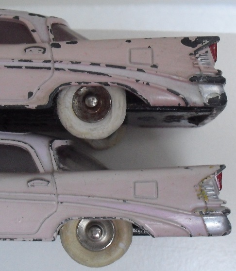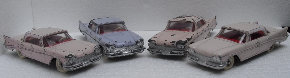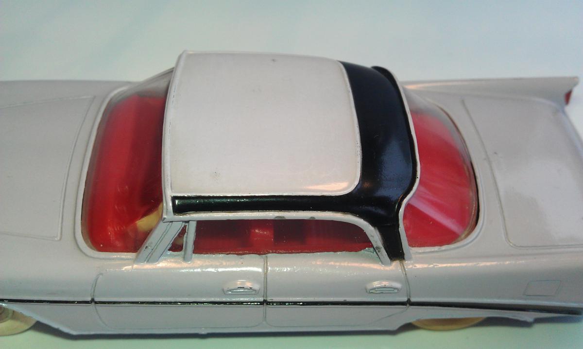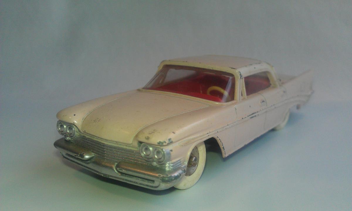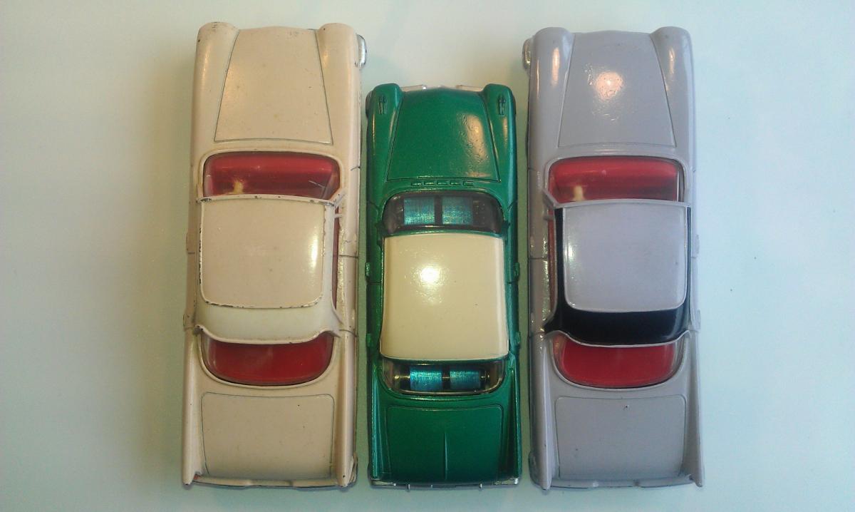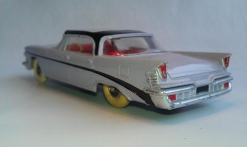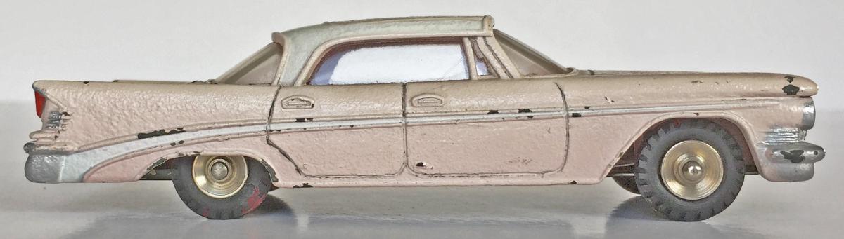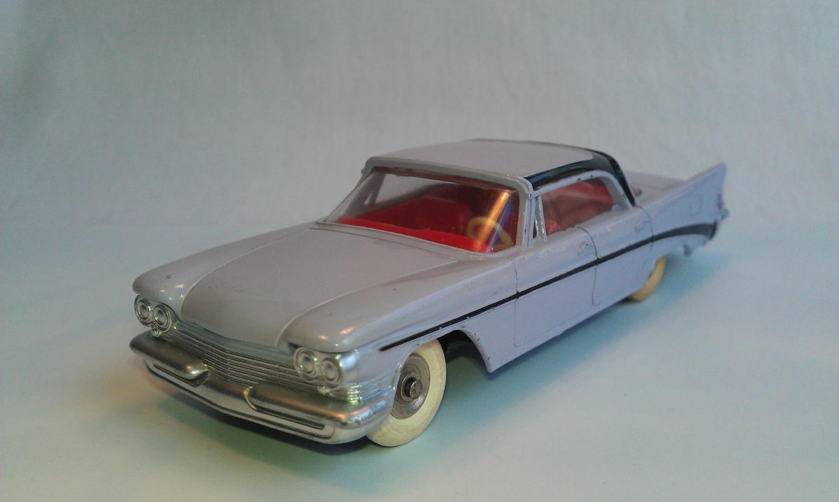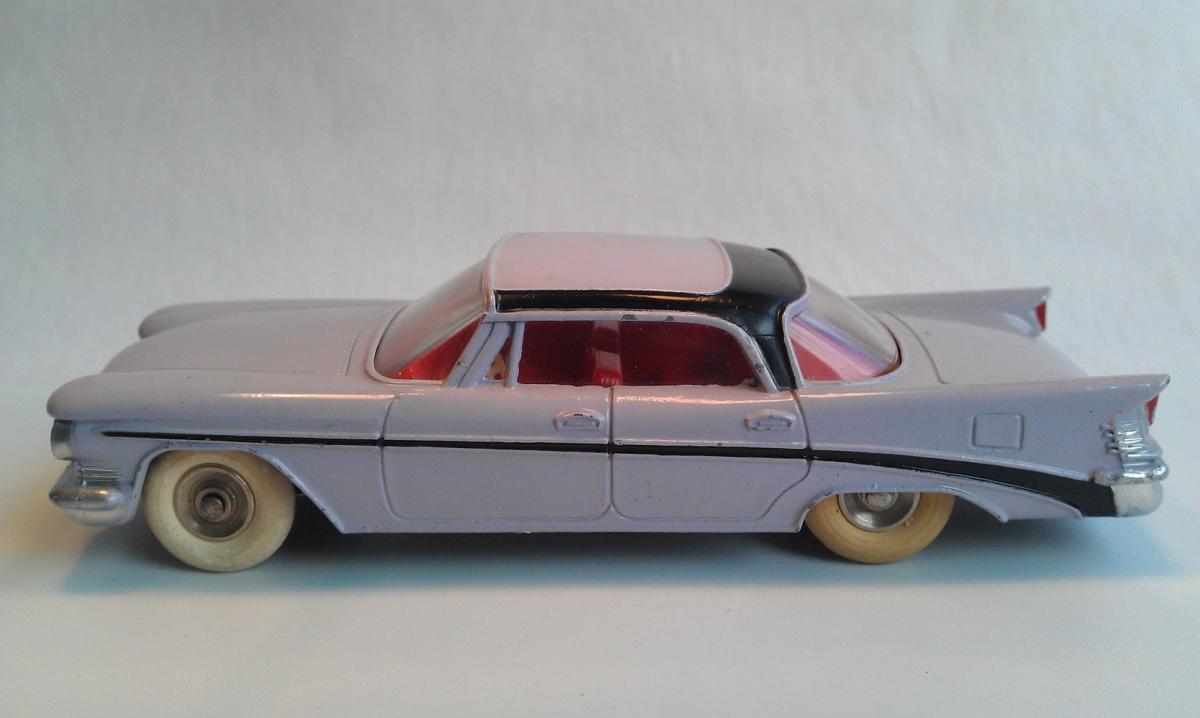 I finally bought one of these a few years ago, partly because I happened to like that era of Chrysler cars, but also I wanted to sample just what these later Dinky Toys had to offer.  My main collecting interest runs to about 1959, but the past few years I have strayed a bit into some of the early 1960's offerings, mostly out of curiosity.  I am posting a photot mine, mainly to show those large white, lightly treaded tires.  I am assuming that those were later than the large white, smooth version.  I also like these treaded tires better than their English counterparts from the late 1950's, that have such large treads, very unattractive on automobiles.  As a side note, mine does not seem to be suffering the lower rear end sag as much......so far at least!