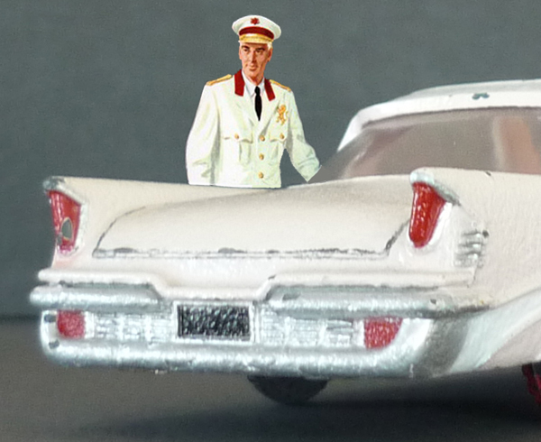 A lot of the remarkable characteristics have to do with the unusual 1/43 scale. Most other American giants have a scale of 1/48. Even most British saloons have a smaller scale of 1/45. This explains the thick ridges along the flash and the huge tyres. The Ford Thunderbird (FDT555) is somewhere in between. Neither the small 15 mm tyres nor the medium 17/18 mm tyres really match.