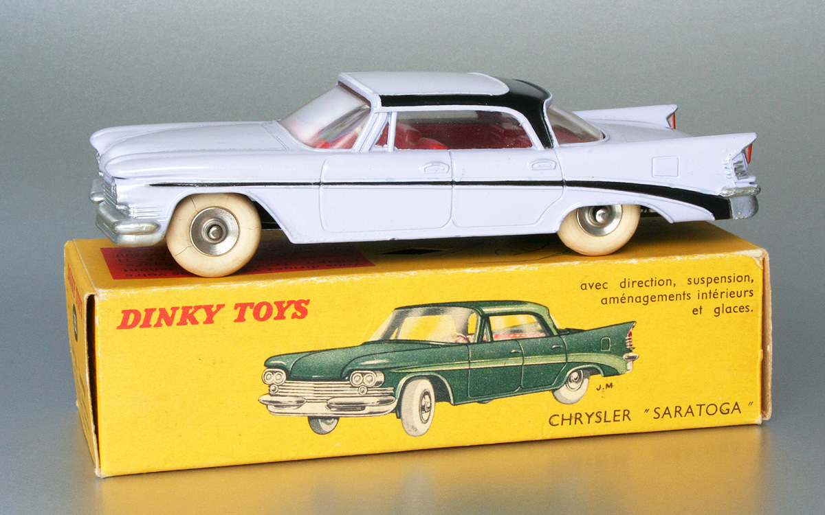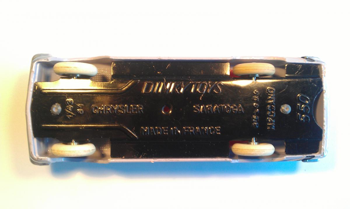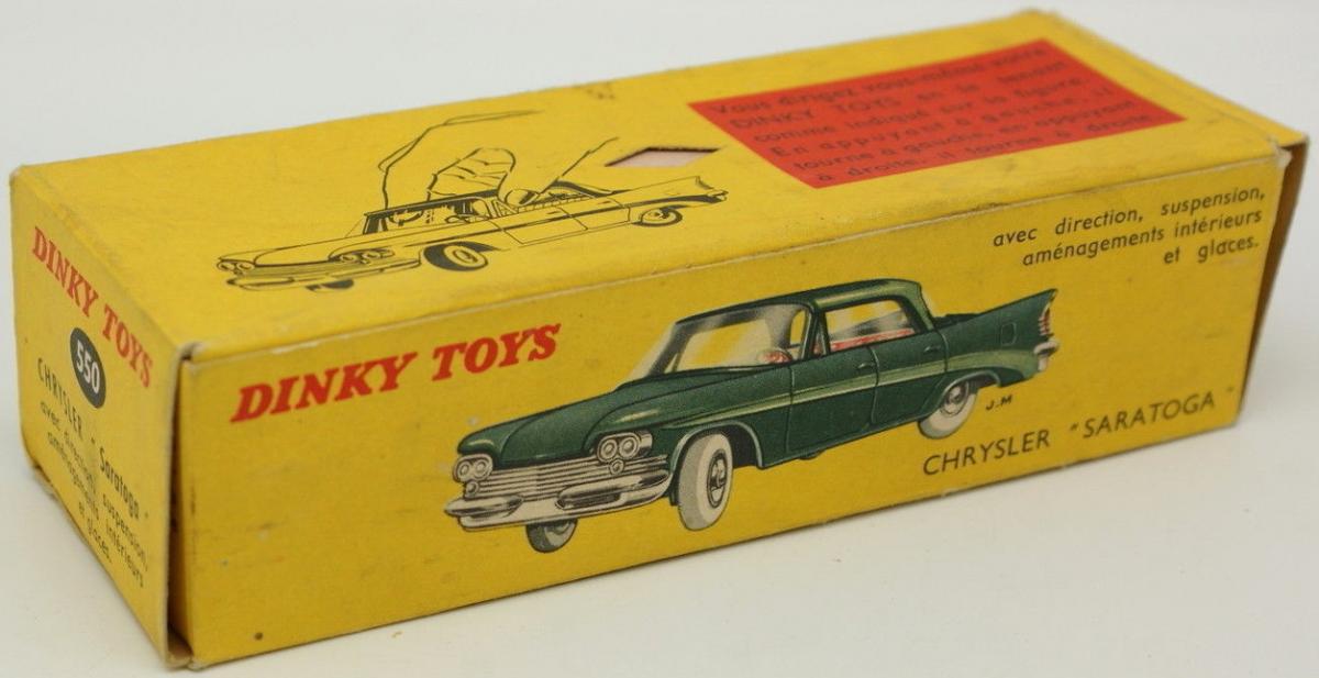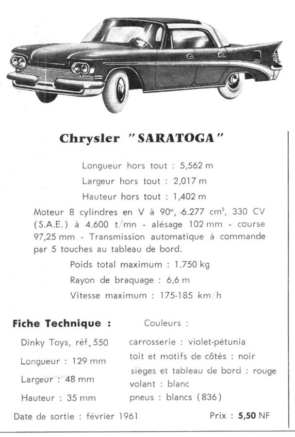 The 550 Chrysler Saratoga was one of the range of imported French Dinky Toys into the UK in 1962. Announced on a specially issued separate UK leaflet from 10-4-1962 with reduced UK prices, following the withdrawal of Purchase Tax Surcharge.