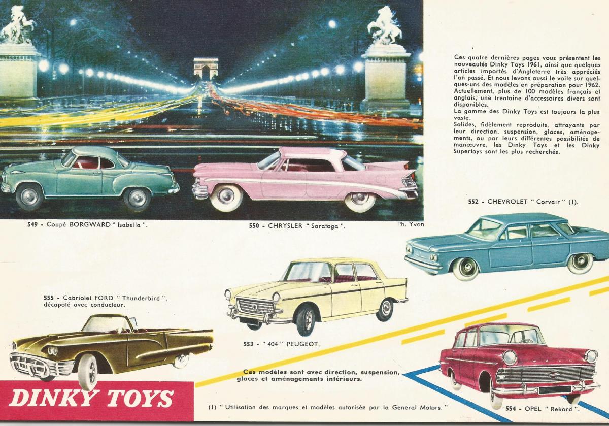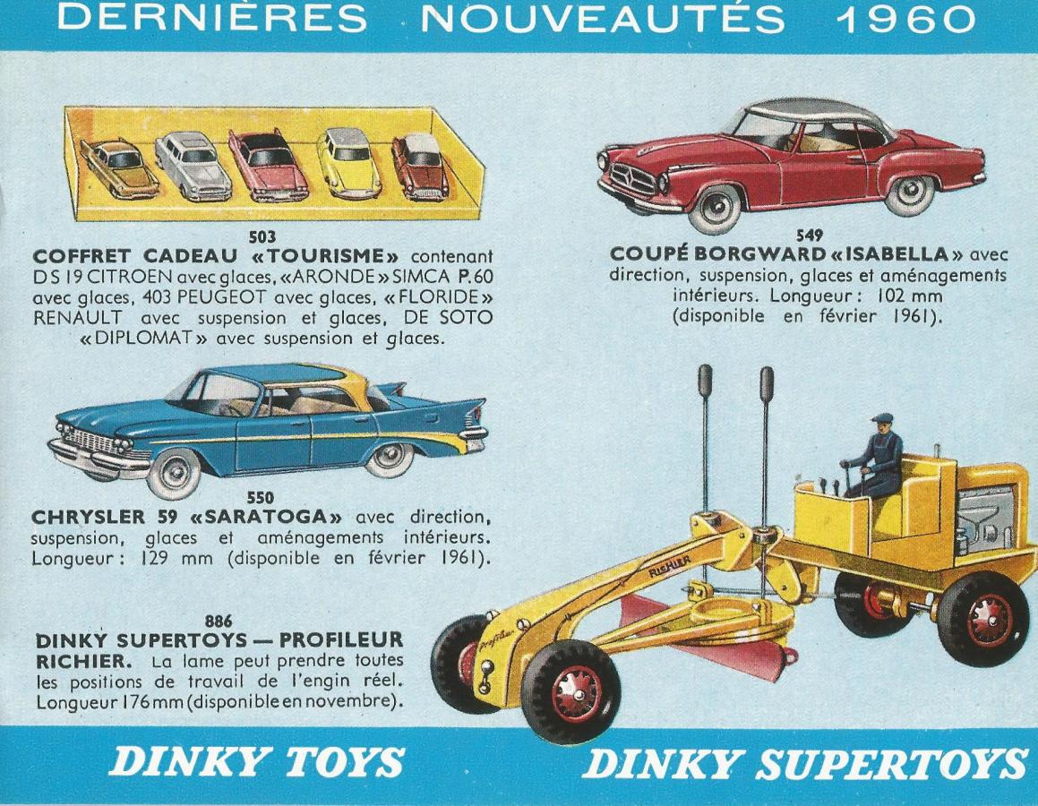 1) In the Dinky Toys catalogue France 1960-2 he appeared for the first time in the never issued colour light blue with yellow flash with the comment: Disponible en février 1961. What strikes is the number 59 in the naming of the model which indicates the year of construction of this car. This indication only occur in this Dinky Toys catalogue 1960-2!
