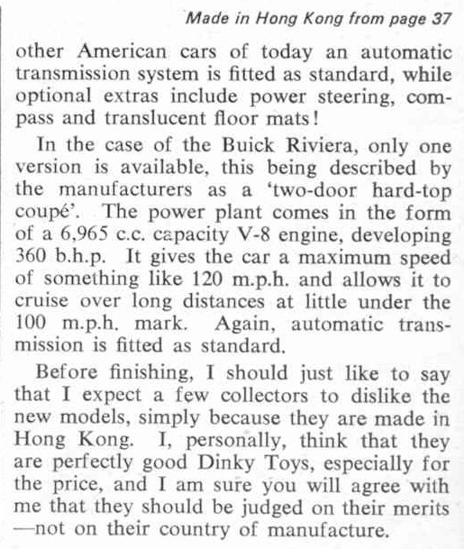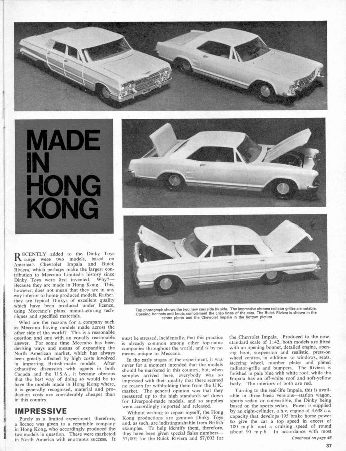 ….“In the early stages of experiment, it was never for a moment intended that the models should be marketed in this country, but, when samples arrived here, everybody was so impressed with their quality that there seemed no reason for withholding them from the U.K. market. The general opinion was that they measured up to the high standards set down for Liverpool-made models, and so supplies were accordingly imported and released. Without wishing to respect myself, the Hong Kong productions are genuine Dinky Toys and, as such, are indistinguishable from British examples. To help identify them, therefore, they have been given special Sales numbers – 57/001 for the Buick Riviera and 57/003 for the Chevrolet Impala. Produced to the now standard scale of 1:42,……”…..