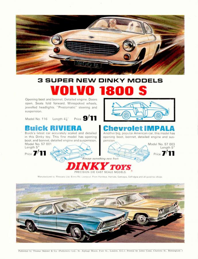 There is still another interesting Dinky Toys, Chevrolet Corvair Monza with an unusual sales number 57/002. This car belongs to a series of 6 American cars (The BIG 6), the so called Hong Kong Dinkies, made for Meccano Ltd in Hong Kong. These were issued by Lines Bros New York, who took over Meccano Ltd in 1964 and were intended for the American market, but 2 models 57/001 Buick Riviera and 57/003 Chevrolet Impala were also released in the UK market and included in the DT catalogue UK 1966-2. They were also advertised in colour on the back page of MM UK June 1966, later shown below.