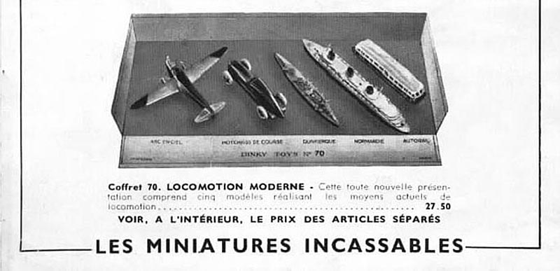 The boxes No 62 and No 70 were also pictured in the Dinky Toy leaflets from 1939, April, May and December. A PDF of this leaflet can be found on the DTCA site from my collection. The Meccano Bobigny pricelist September 1940 still lists the No 70 Coffret "Locomotion moderne" at Francs 32. The Coffret luxe Avions No 62 is indicated as suspendu in this pricelist.