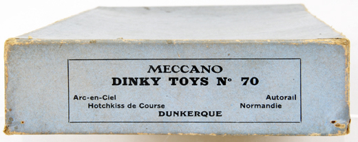 The late french dinky leaflets from 1939 in which set 70 is also pictured (and there's one extravagantly for sale on ebay at the moment) shows that the french 23b can be purchased separately for 3.5 francs  - and this is titled "Hotchkiss de course".  The picture shows the french 23b that we know - diagonal radiator lines, round nose and single-pane windscreen.  This is more like a renault nervasport than a hotchkiss, of course.      The picture of the car in the 70 set also looks more like the french than the uk 23b, so I would say all the models in the box were of french origin.