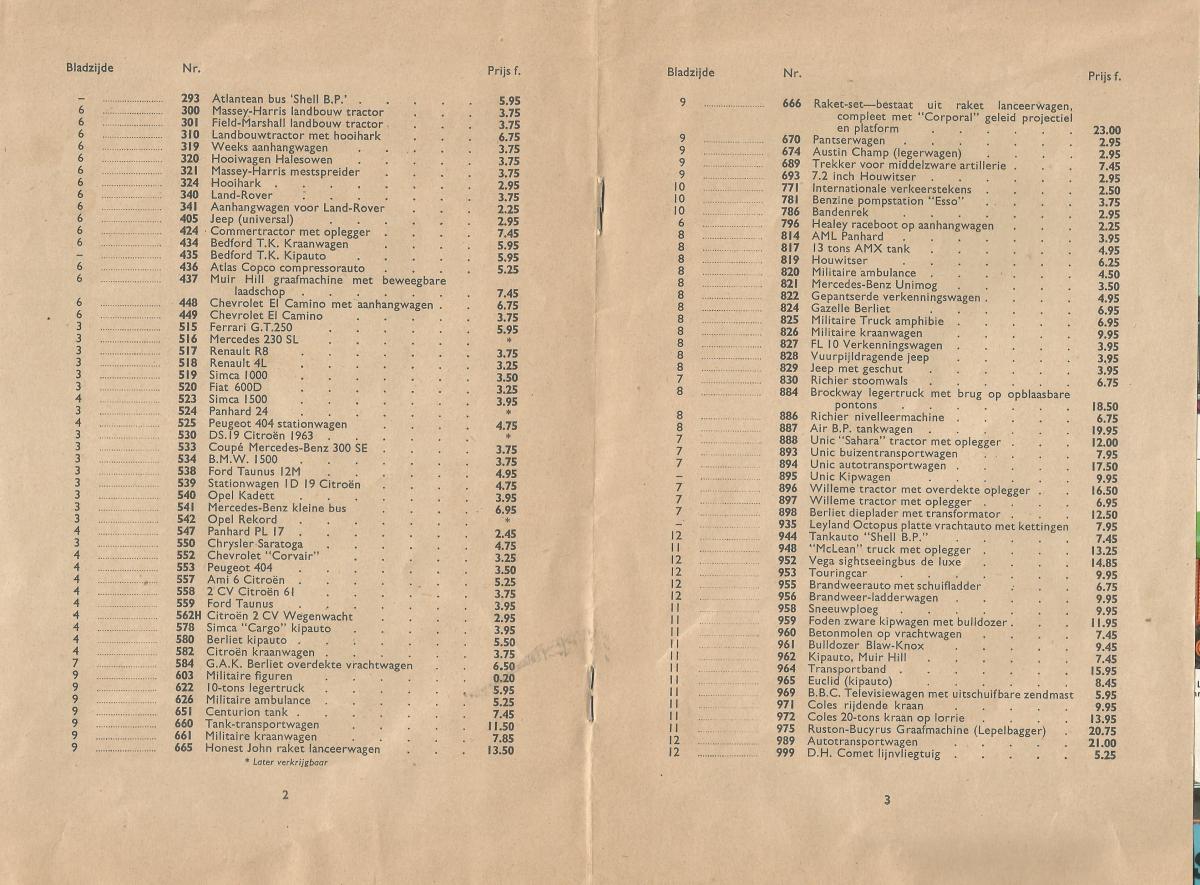 Jan W., thanks for adding the price list that was an addendum to the 1965 catalogue. It is quite possible this price list was printed in The Netherlands as a result of stock that was still available in that country in 1965. Not knowing whether this price list was actually printed by Meccano (there is no print number showing) or by the distributor who had procured a supply of International Editions into which this price list was stapled, is unfortunate. Could you please check to see if there are any print details on your price list and if so, if a copy of the first and last pages can be included in this Topic. All very interesting. I have a feeling it was the work of The Netherlands distributor or a toy shop in one of the bigger cities.
