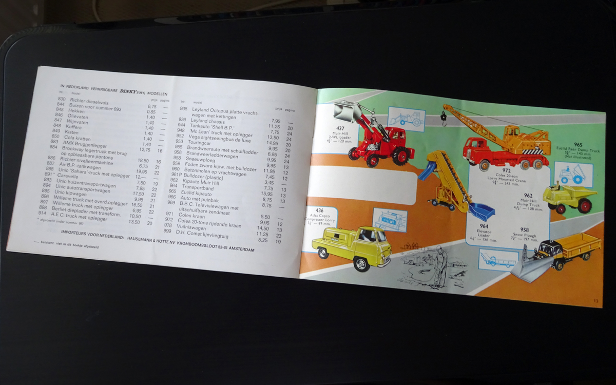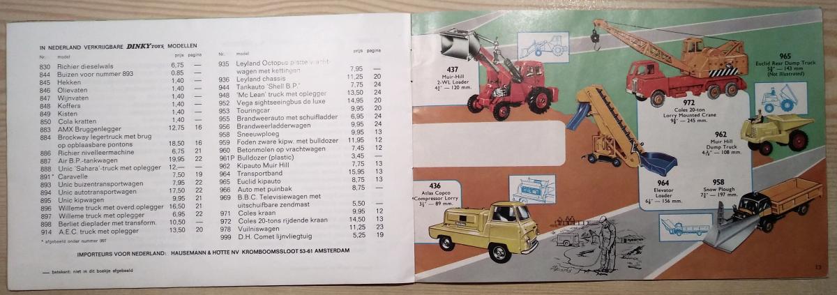 Hello Bruce and Jan, some additional pictures then of the catalogue in question below, which I hope will give more clarity. In my opinion every country, language or market had to complete this 'universal' 1965 catalogue by supplying the specific data of models available in that market area and the related prices involved. The price list section, though not bearing any printing mark, is printed on the same quality paper (weight, printing surface) as the rest of the catalogue and must be an integral part of the catalogue production in my opinion, not a later incidental insert. Hausemann & Hötte have been the sole official Meccano agent in NL since 1922. The sticker on the back is not from a major toy shop but, on the contrary, from a village toy shop in Driebergen, in the province of Utrecht (NL). May be Jan O. has, or knows, other examples of this Dutch 1965 catalogue for comparison. Hope this helps, kind regards, Jan