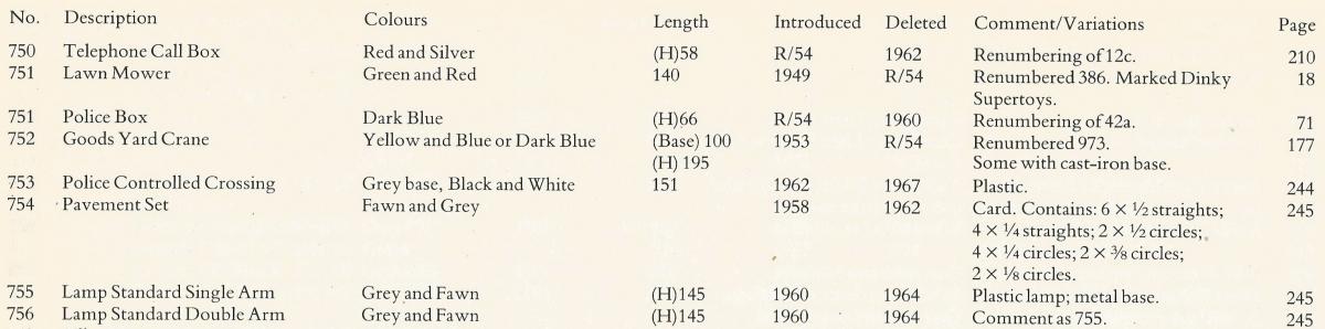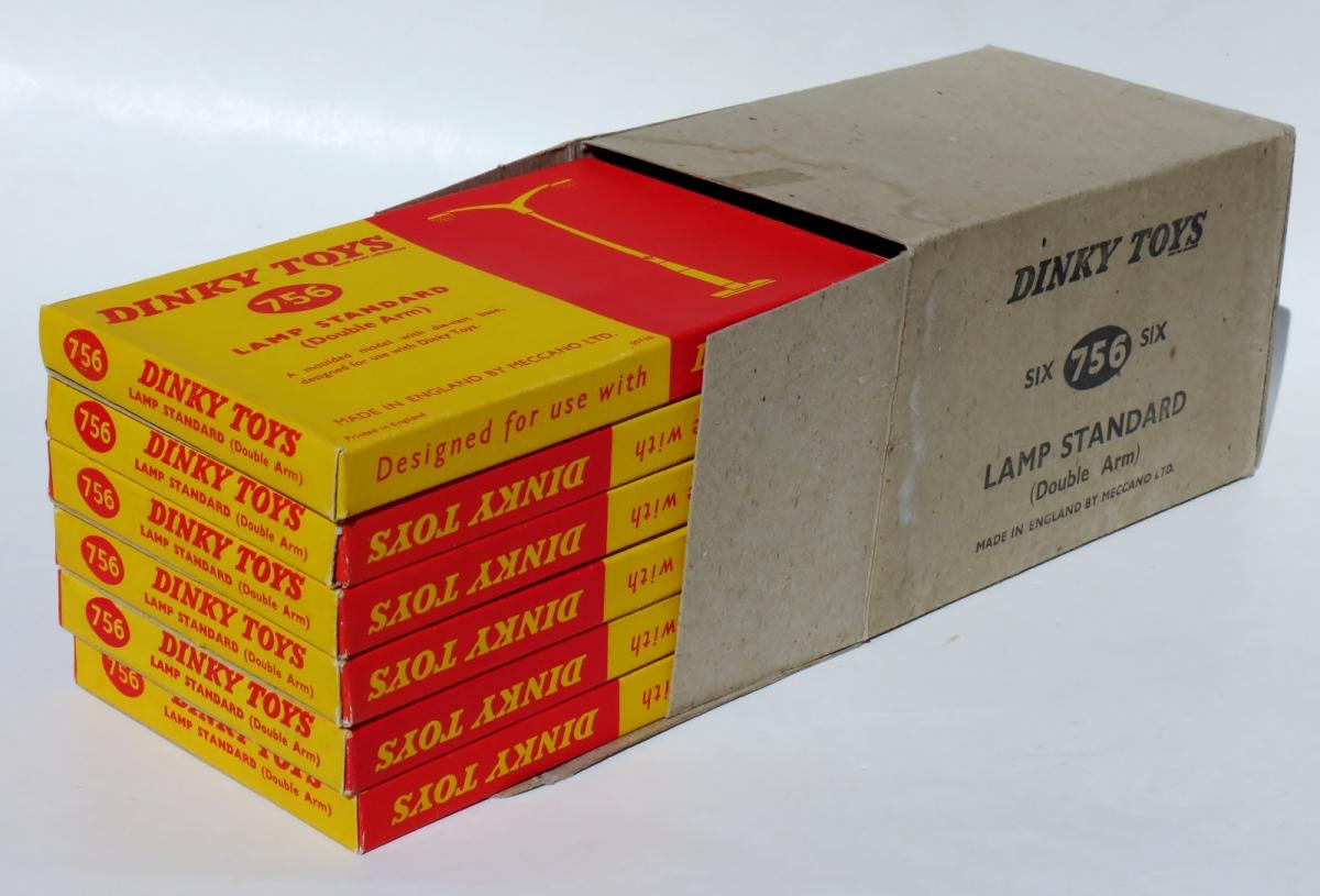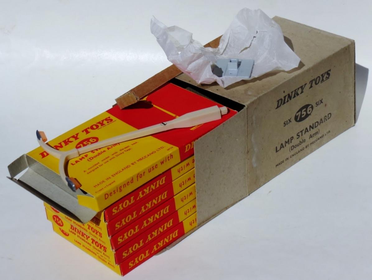 Hello Bruce and Jan, I had a little check in my Dutch Dinky Toys catalogues and had the remarkable experience that this no. 756 double arm lamp standard is present in the 1963 catalogue, subsequently wanting in the 1964 catalogue and it re-appears in the 1965 catalogue, albeit in the price list only and not pictured in the catalogue. The 1965 catalogue is in fact a 'universal', international one, but the original Hausemann & Hötte price list inserted is in Dutch, stapled in the center: 'In Nederland verkrijgbare Dinky Toys modellen' [Dinky Toys models available in The Netherlands]. So it may be that we should be a bit flexible with dates of issue and discontinuation, as they may probably incidentally differ per market or national agent. It is for instance remarkable too that the no. 581 Horse Box is shown in the section of new and re-introduced models in the Dutch October 1952 catalogue, whereas it was introduced as 'New' in the Meccano Magazine of - as late as - April 1953. Possibly export had priority? All catalogues referred to can be found under the 'Publications' header, so you might have a check yourself. Interesting, isn't it? Kind regards, Jan