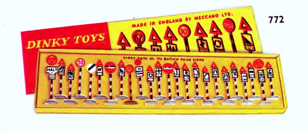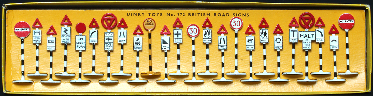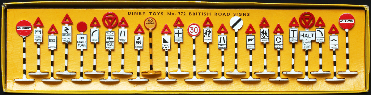 Actually, I have located 46 772 British Road Signs that have been auctioned through quite a number of auction sites over the past 15 years of which six lots match the catalogue picture.  Of course it might be just a coincidence, or these six were never used for the purpose for which they were intended. Or, they had extremely fastidious owners who returned each sign into its "rightful" place! Of the remaining 40 sets, as far as I could quickly tell, none match any other set, they were all different - signs all over the place, with some even containing two or three of one sign. I think there is a message there in that packaging of the set was regimented to a certain degree.