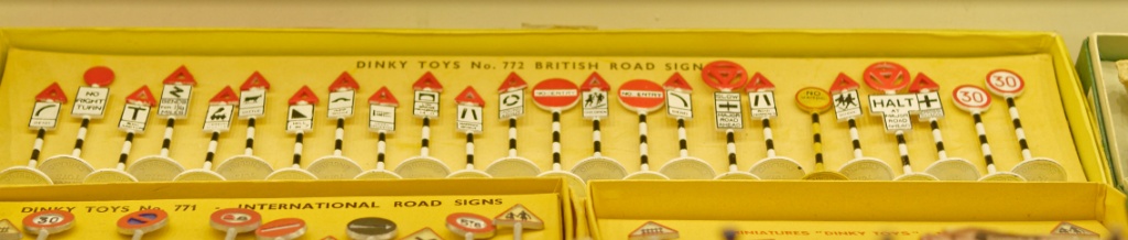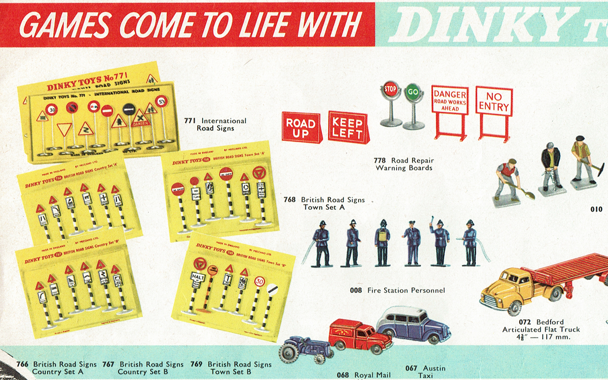 Now it matches the picture in my 1959 Dinky Toys catalogue. However, there is one difference, because the Derestriction sign in the catalogue illustration is replaced by a ‘30’ sign in my set. Indeed, it appears that there are sets with one Derestriction sign and one ‘30’ sign, and deviating sets lacking the Derestriction Sign but containing two ‘30’ signs. In DT&MM (Compendium page 62) and the GBofDT (page 153) this is indicated by: ‘30/Derestriction (2)’. Kind regards, Jan