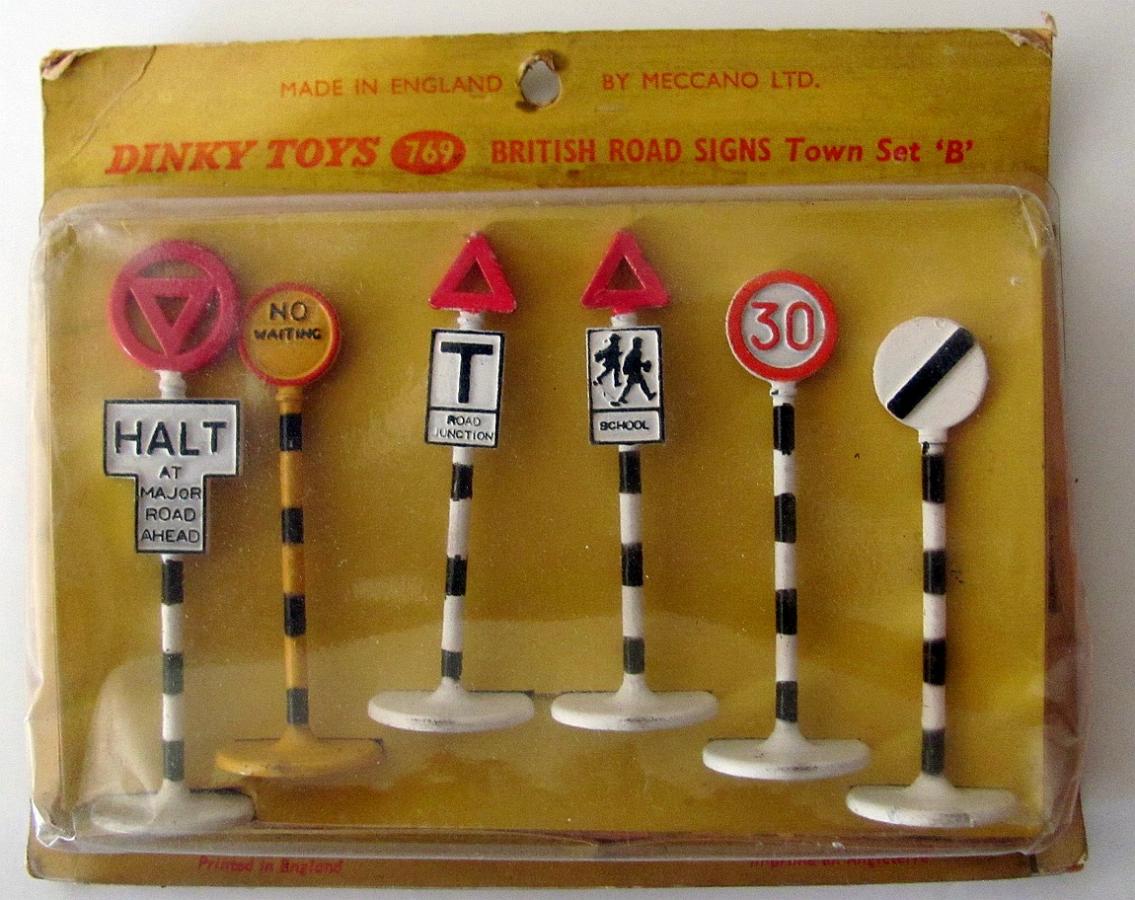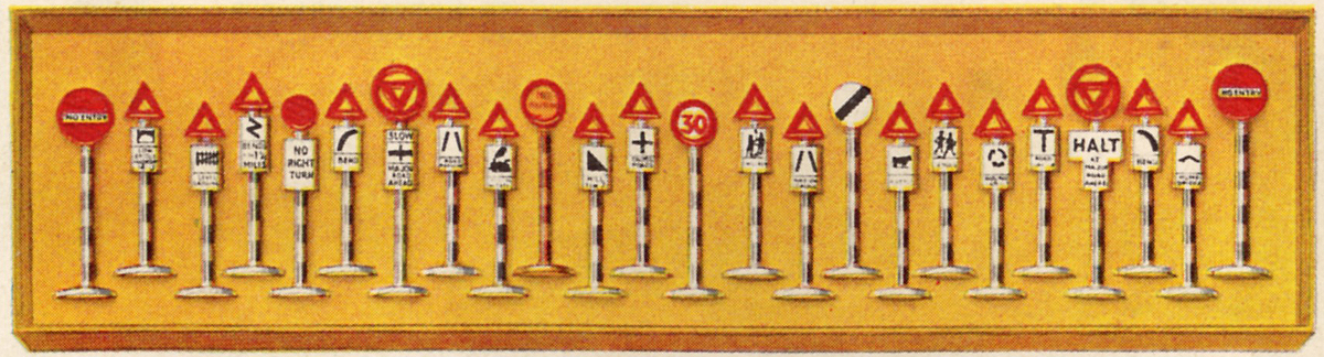 Hello Terry, this exceptionally coloured sign belongs to the no. 769 British Road Signs Town set, half a dozen signs. I found several, single or the set, on the internet. See also the Vectis image and the 1964 catalogue page detail shown below. Another half a dozen in the complementary British Road Signs Country Set no. 767. Both available 1959-1964. So you might place these pictures in the 769 thread. The others shown (with black - not white - bases) are from the early, more familiar no. 47 / 770 Road Signs Set. Kind regards, Jan
