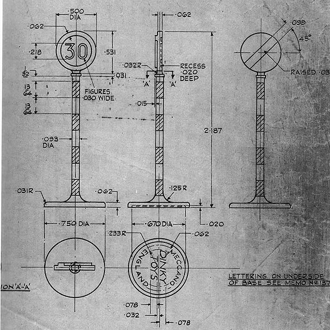 Here (courtesy of the Dinky Toys Encyclopedia) is the drawing for the 30/derestriction sign: