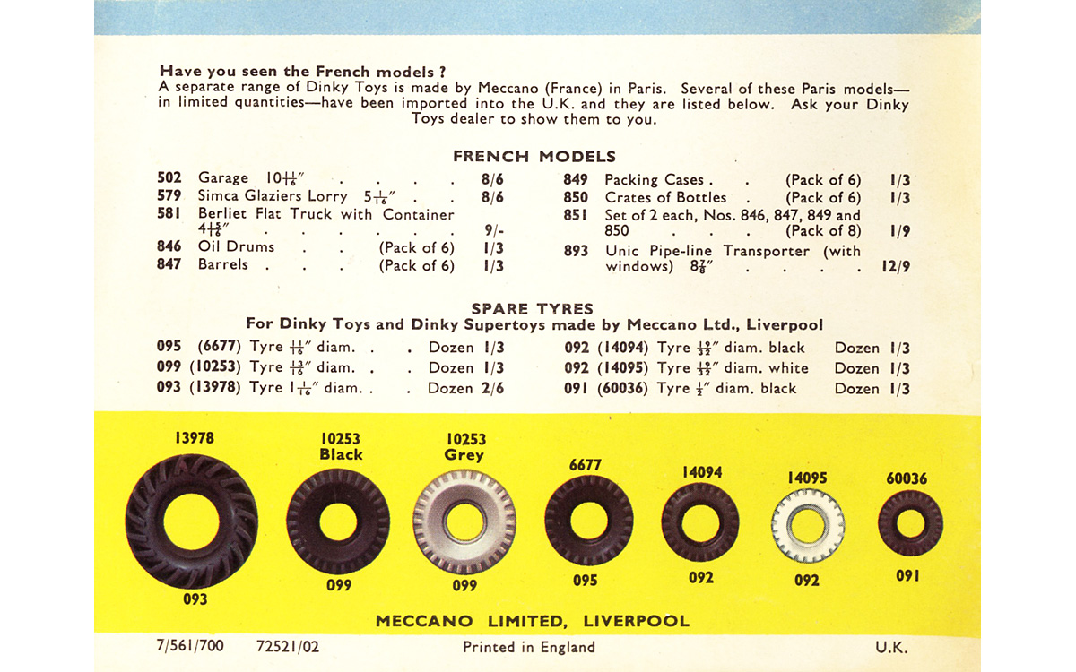 Cast on the back of the right inside leg: DINKY TOYS, and the left leg: MADE IN ENGLAND. Cast on the front right inside leg: TYRE RACK, and the left leg: MECCANO.