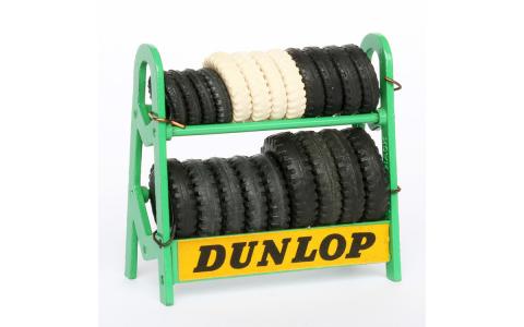 The no. 786 Tyre Rack with Tyres is painted green, with 'DUNLOP' transfer in front, in black capitals on the ocher yellow background. It contains altogether 21 various treaded tyres divided into five size/colour categories, above from left to right: