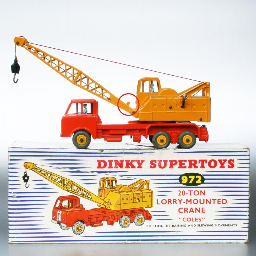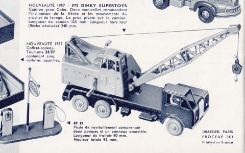 With reference to Richard's recent posting in the British 972 thread, regarding his new arrival and its comparison with the French 972, it struck me once more that, besides the generally known differences between them, there is also a difference in the tiny little 'bumper' on top of the crane arm's base. The British one is more elongated, slim, with a round top, whereas the French counterpart is more rectangular, square. This seems to be a 'rule' for every example I have seen. Or have exceptions been spotted? I cannot explain this difference and the reason for it, because, as far as I know, all major cast components came from the same Liverpool factory, to be assembled in Bobigny. Any comments, opinions about this? The two comparative pictures below (and a nice 1957 Meccano catalogue picture). Kind regards, Jan
