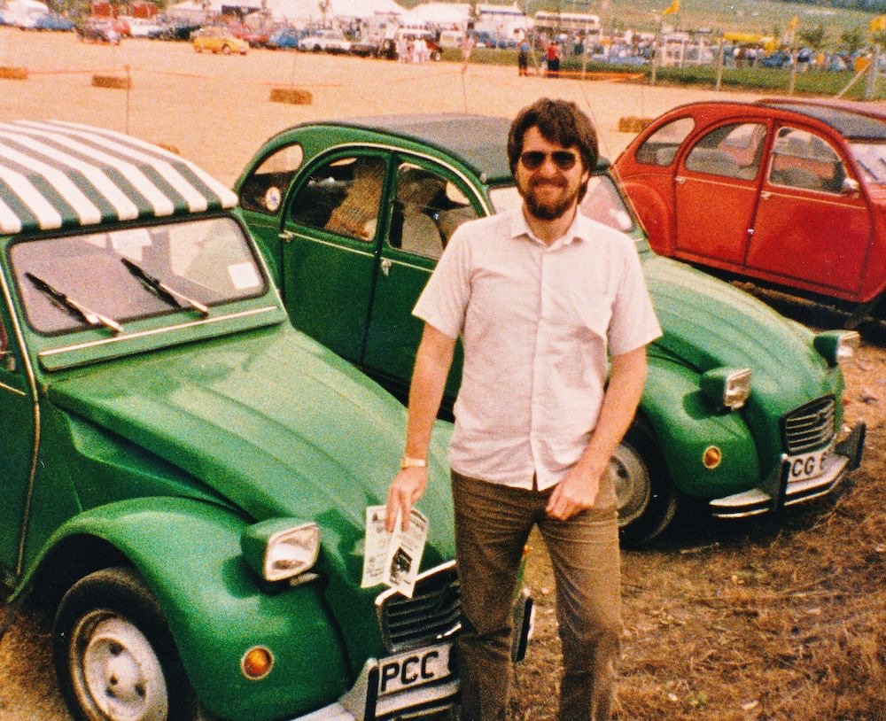 Later on Fiona was my honeymoon car. My bride and I were driving to Cornwall, but along the way we couldn't help but notice a steady stream of 2CVs, Dyanes, and Amis going in the opposite direction, particularly since their drivers were flashing their lights at us. Finally we grew sufficiently curious that we turned around to follow the caravan. It led to what proved to be a very large gathering of Citroens, the 1985 2CV World Rally at Cheltenham. I cannot resist attaching a photo of myself and Fiona taken that day.