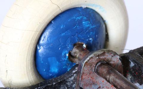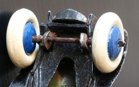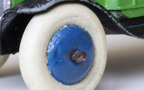 Here is a closeup photo of a blue wheel, from one of my pre-war Mechanical Horse Railroad Trailers.......complete with fatigue cracks!
