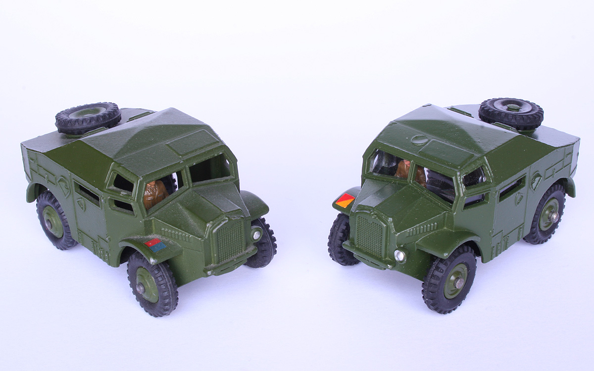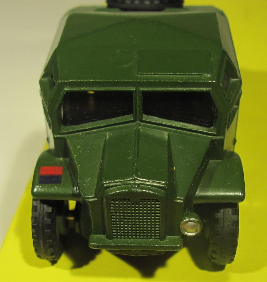 Two examples of mine, the early one and a very late one, showing that as soon as plastic windows were applied the casting apparently had to be adjusted in such a way that a small round 'scar' appeared on the roof just above the driver. The late example also shows that the red/yellow insignia (a sticker now instead of the familiar red/blue transfer) cannot be a factory error but a structural feature, apparently saving cost by giving all surviving military models the same sticker. I presume, David, that's why you put 'factory error' between apostrophes. There is also an intermediary one in my collection - plastic hubs, plastic windows - that still shows the previous red/blue transfer - and also the round casting scar on the roof. Both later ones with satin/mattish base plates. Kind regards, Jan