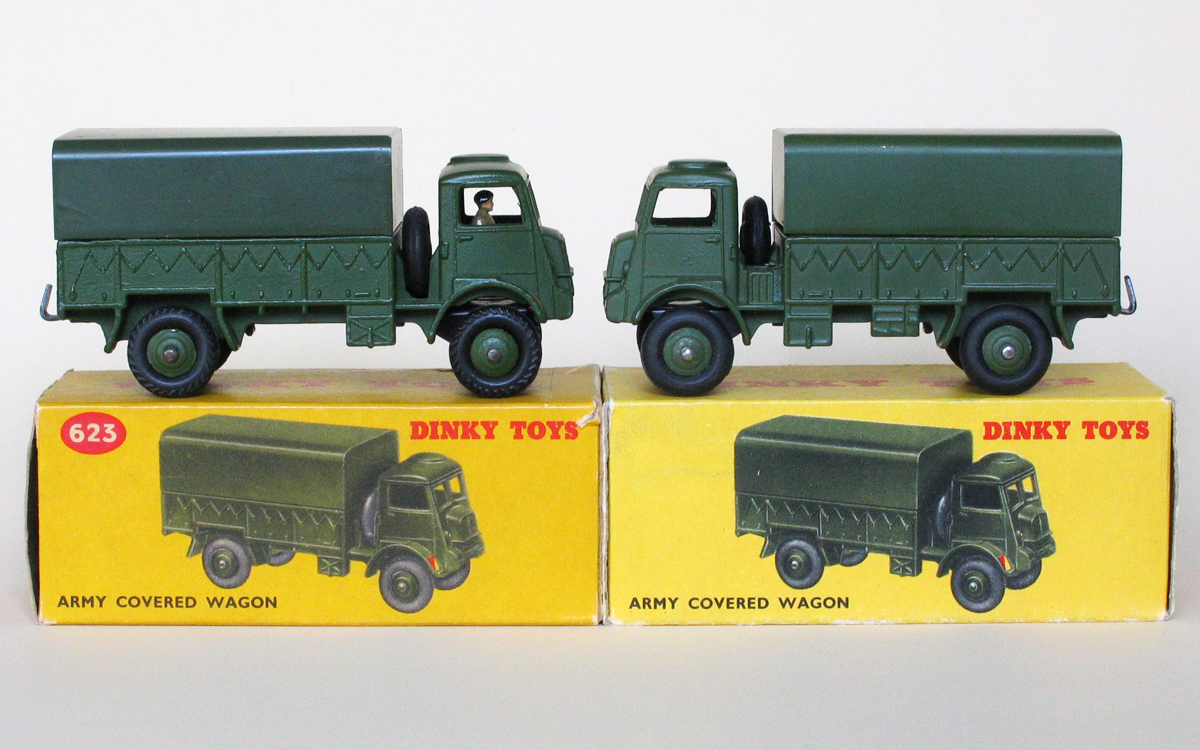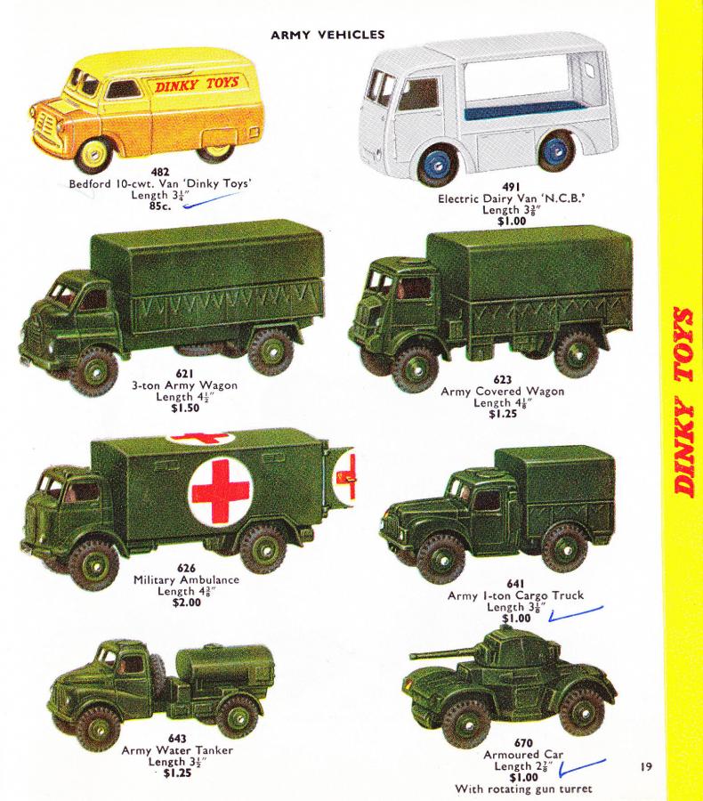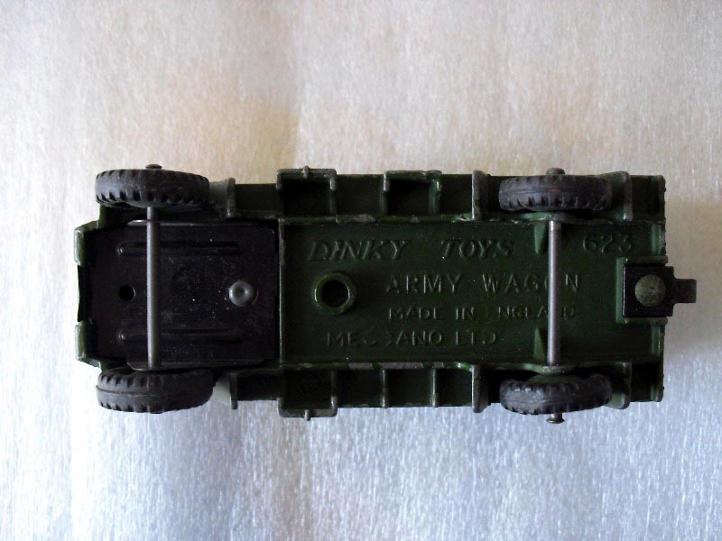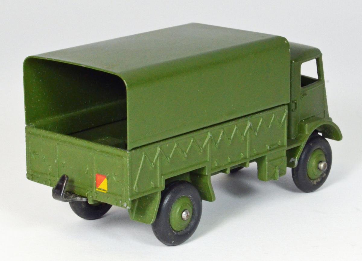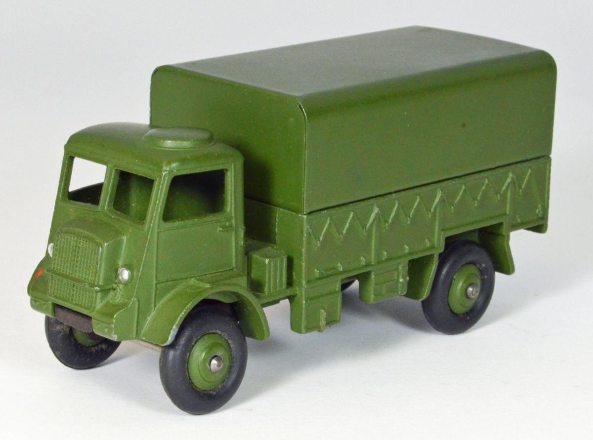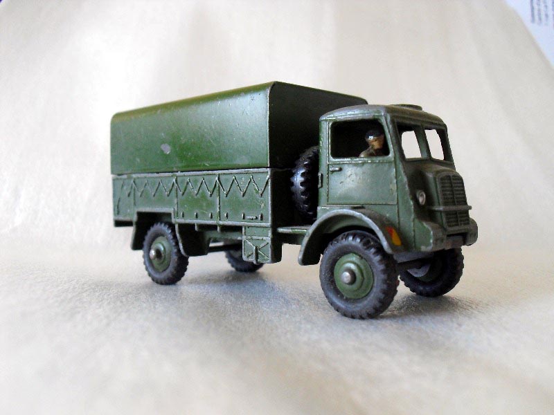 I will try and provide a little more background on this nice military truck model that Dinky produced. It was first introduced in the 1954/1955 catalog, and is modeled after the Bedford QL Army Wagon, which was a 3-ton 4x4 vehicle. It was produced from 1941 through 1945, and several different versions were ultimately made. The first Dinky models did not include a driver, but later ones did. The treaded tires first appear in the 1958 catalog. A very nice and accurate model, as shown by observing the attached photo of a real Bedford.