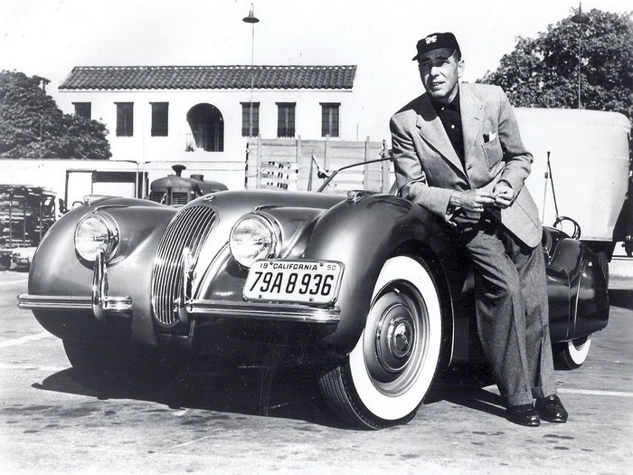 Humphrey Bogart with his Jaguar XK 120 with California license plate dated 1950.