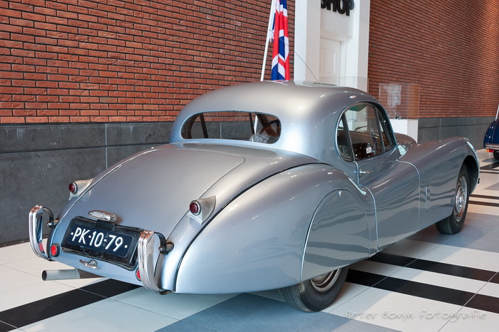 This model is in the Louwman museum in The Hague, has never been restored and still bears its original Dutch license plate. The metallic blue paint is original. Almost 2700 copies of this XK120 Fixed Head Coupé model are built, of which only 195 with the steering wheel on the right side, because most Jaguars are intended for export.