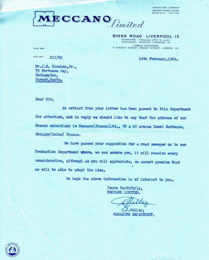 On the matter of the John Kinchen ephemera Post 556 above, herewith are copies of two letters from this collection when John endeavoured to buy a French Dinky Toys 596 LMV Road-Sweeper/Washer in December 1963. John was referred to the French factory and his suggestion that such a model be included in the English Meccano inventory would be passed to the Production Department for consideration where it will be given every consideration but no guarantee can be given that his idea will be adopted.