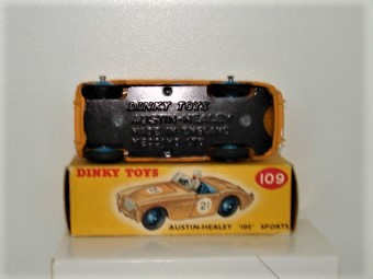 Yesterday the Houten Toy Fair was on. I found a very nice late 109 Austin Healey Sports. It has the racing number 28 without the normal white discs. The model has a shiny base plate without the model number on it and treaded tires.