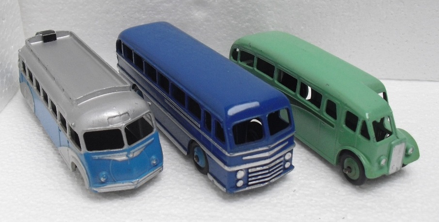 Richard--Very nice little collection of buses you got all at once......and they do look to be in pretty nice condition. I also have the green single deck bus, with no stripe on the bottom. I still remember the day that I got it...a good friend, who also collected, went to downtown Los Angeles with his parents, and found a toy store that sold Dinky's. He managed to find two of those buses, so I got one of them...and that was in 1958-1959. I still can't figure out how or why they still had those in stock as they had been discontinued many years earlier. And that Isobloc is nice and an early one with the smooth roof area. That is one of my all-time favorite Dinky buses.....you did very well!