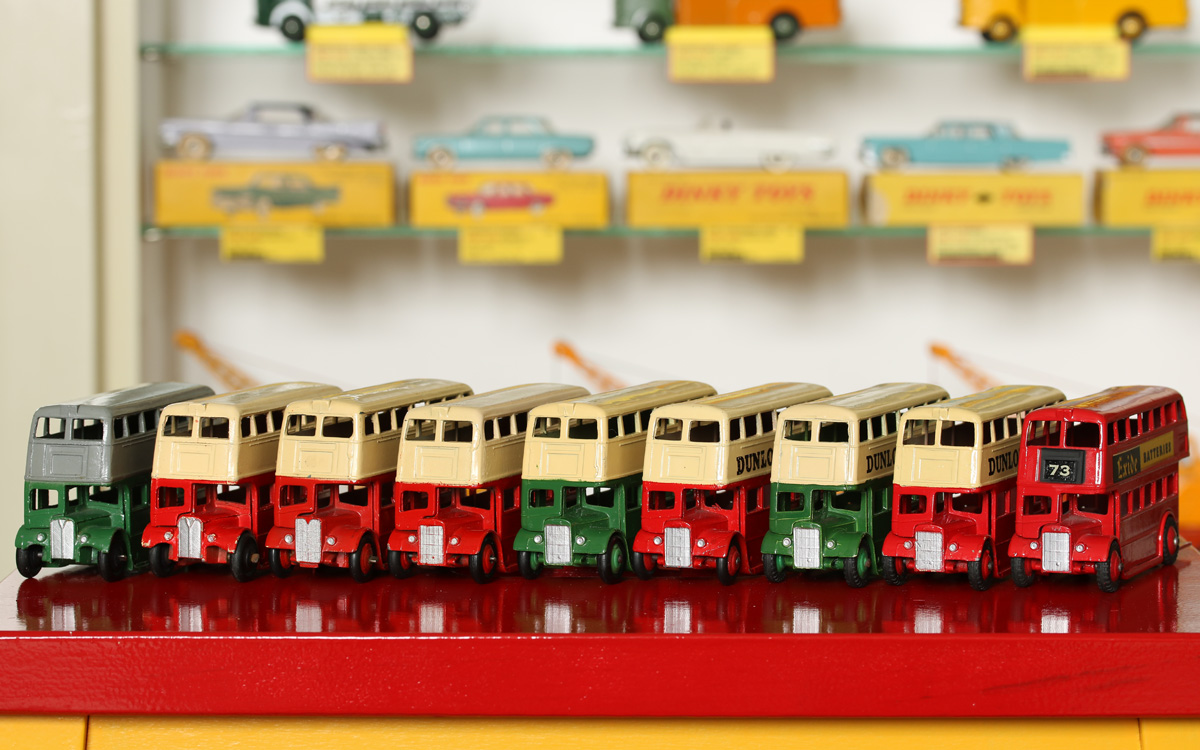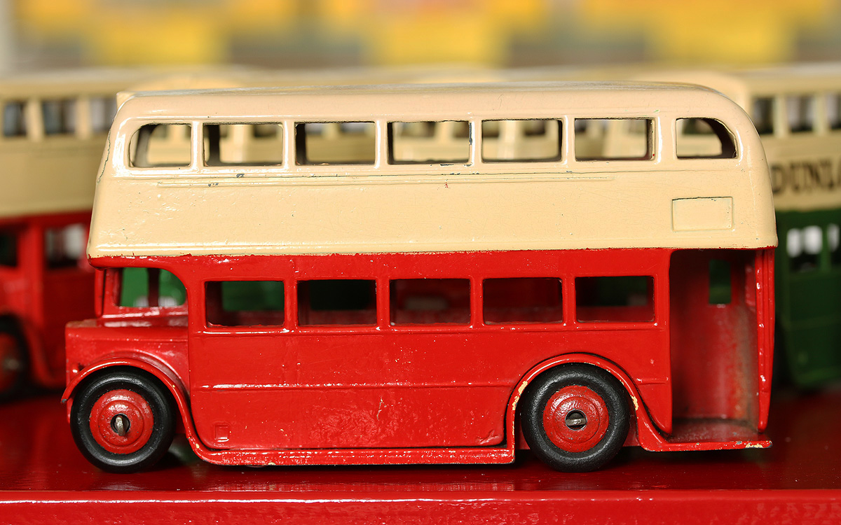 I acquired my first Double Decker Bus on the 24th of May 1980, the fourth item from the right. Yesterday my ninth Double Decker variant was delivered, the latest arrival: red/cream, third type front, crimped axle ends, roof box, no advertising, made 1948-1952, in very good condition. Parked as fourth from the left. I am very happy with it! Kind regards, Jan