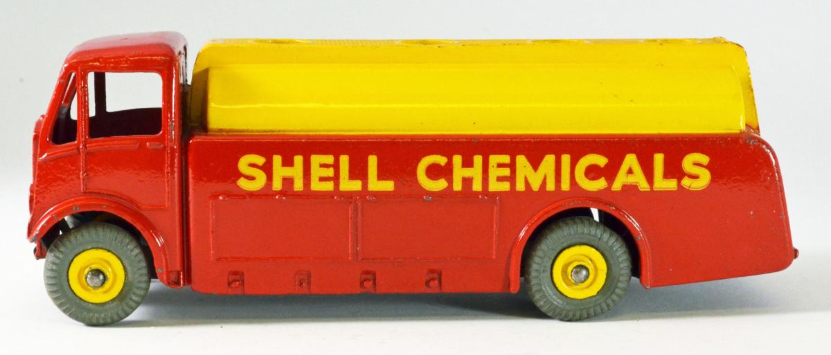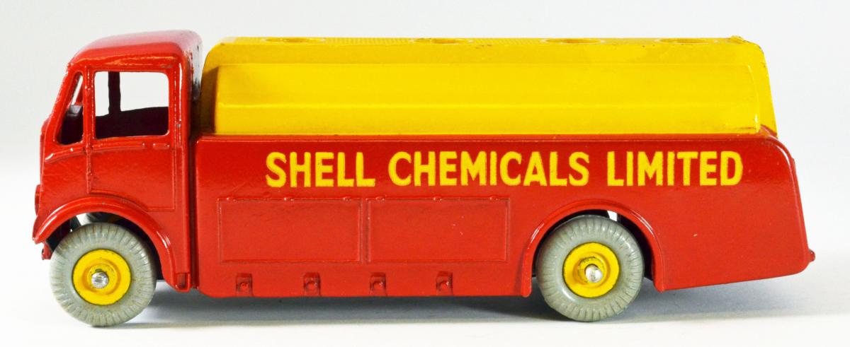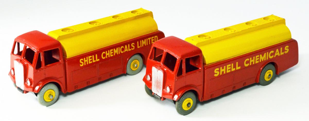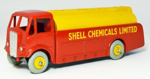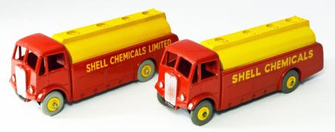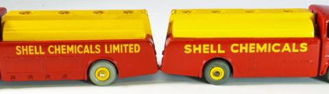591/991 Shell Chemicals had the 1948 scallop logo on the rear from 1952 on. It was in Shell red/yellow livery. I attach photos of my pair. The first a blue striped Dinky Toys boxed Shell Chemicals Limited with black tyres, Dinky Toys base and blocky close text, clearly tampo printed. The second a 991 Dinky Supertoys Shell Chemicals with replaced grey tyres.