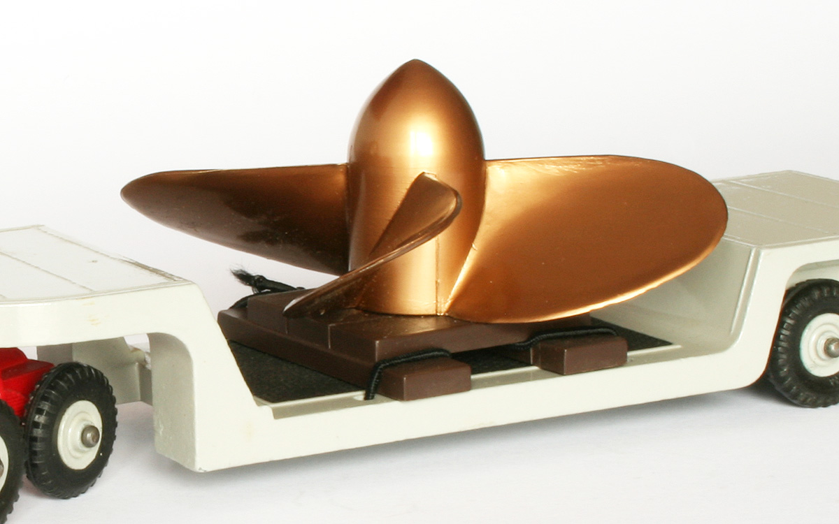 One thing I have noticed, is that correctly positioned, the insert sits a fraction above the bottom half of the box the cause possibly being the propeller itself. I previously had no problems when the insert was inserted upside down with the little cardboard ring keeping the larger cardboard insert in place and not “flopping around”. Is it possible my propeller is a reproduction as it does not have the Scimitar transfer or any markings underneath and it may be a fraction taller. Also my model did not have the usual plastic “ropes” holding the propeller onto its pallet and then the trailer, instead very old, and what looked like hardened, black rubber bands. These unfortunately disintegrated over a decade ago.