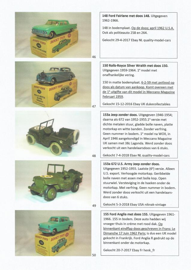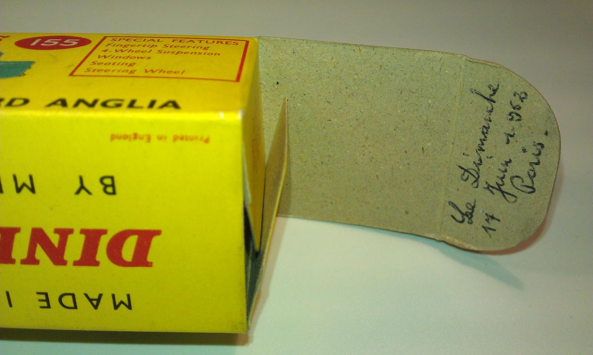 While inventorying and checking my stock of boxes, I was surprised to discover this note in my 155 box. It was stated on the inside of the lip of an end flap: Le Dimanche 17 Juin 1962 Paris, indicating that this UK model was purchased in France. The France catalog of 1962 also confirms that this model was sold in France with the number 155 L. I always wondered whether there might have been an L on the box of a UK model sold in France, as indicated in the French catalog, but that is not the case. Just an original UK box without any addition. I have become wiser again. I also discovered some Quality Control Stamps on the inside lip of an end flap of some boxes that I had not seen before.