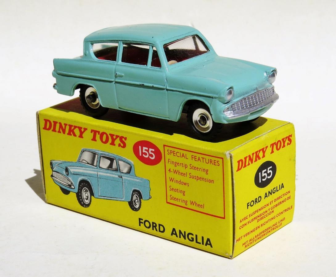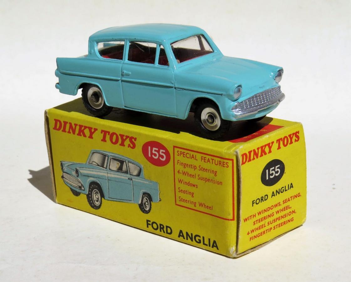 As for the 155 production time frame, most references have it in production until 1966. The model made its last catalogue/leaflet appearance in August 1965 priced at 3/11 but by the time a price list leaflet was published the following month, September 1965 the 155 Ford Anglia was not included. So one can safely say that the Anglia had been deleted by this date. Of course, the model would still have been available after this time in most toy shops, and certainly much longer in Australia.