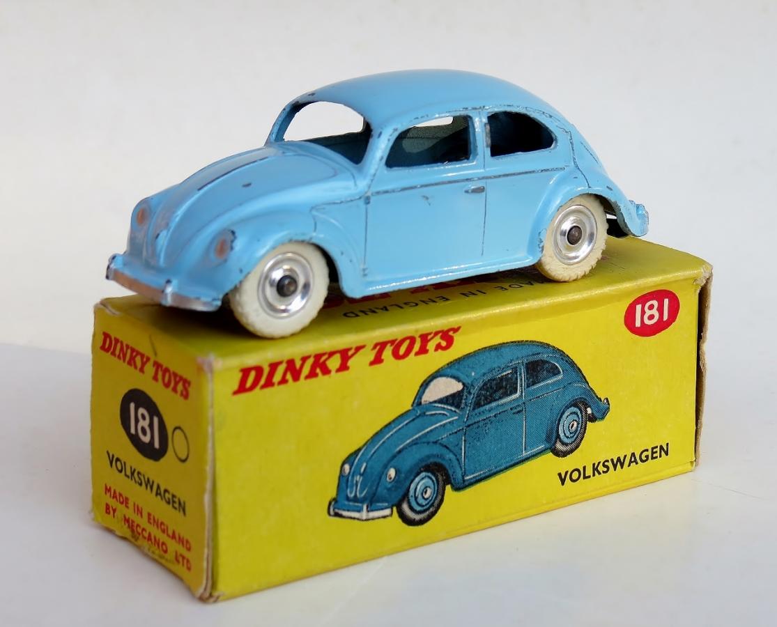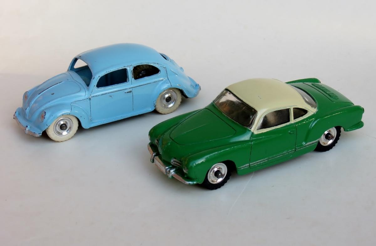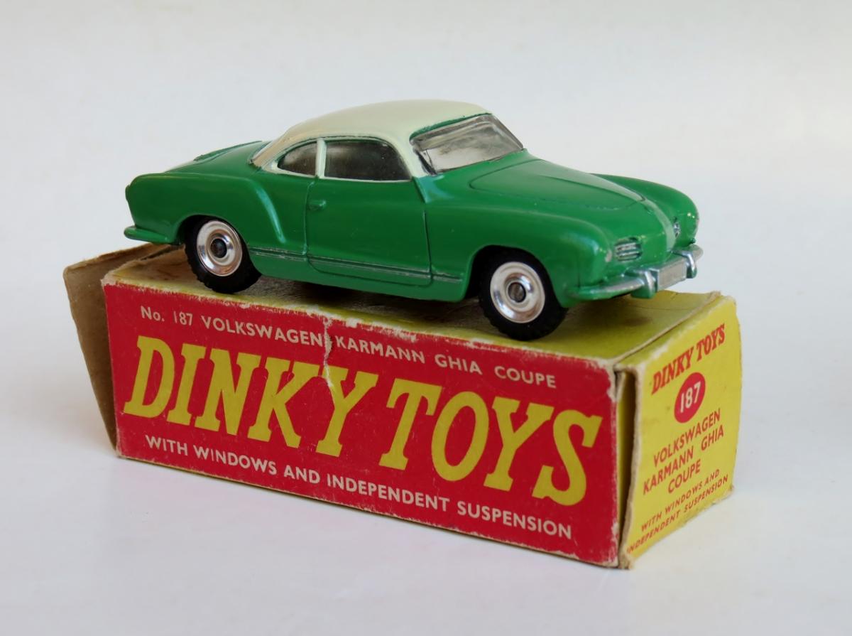 Back in late 1961, having received a 181 Volkswagen the year before in light blue, spun hubs, shiny base plate and no sales number, I received a 187 Volkswagen Karmann Ghia in green and cream. I decided to switch the black tyres on the 181 to the 187 and put the 187 white treaded tyres on the 181. I was quite pleased with the effect especially the black tyres on the 187 so I left them on their respective models.