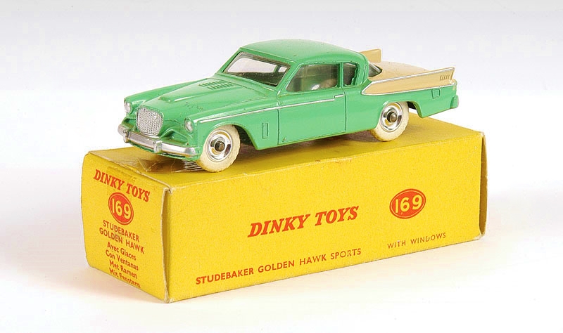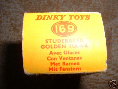 The interesting thing about this box is that the model has an additional word added to its description, Studebaker Golden Hawk SPORTS with the word "Sports" not appearing in the more common pictorial end-flap yellow box, not does the word appear in any catalogue or price list.